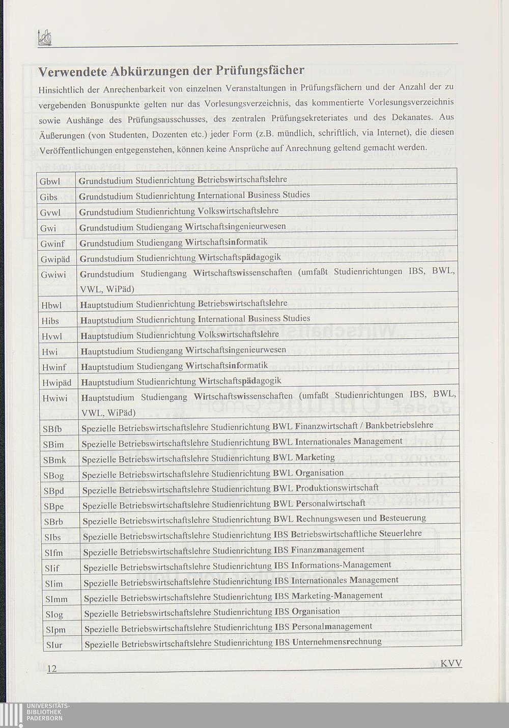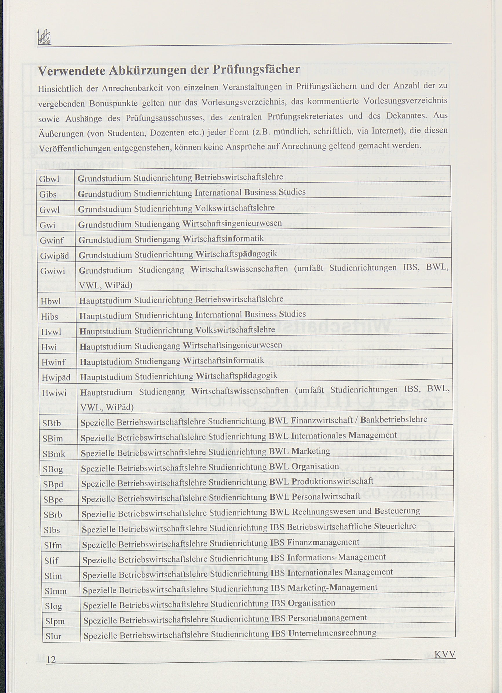Verwendete Abkürzungen für die Prüfungsfächer