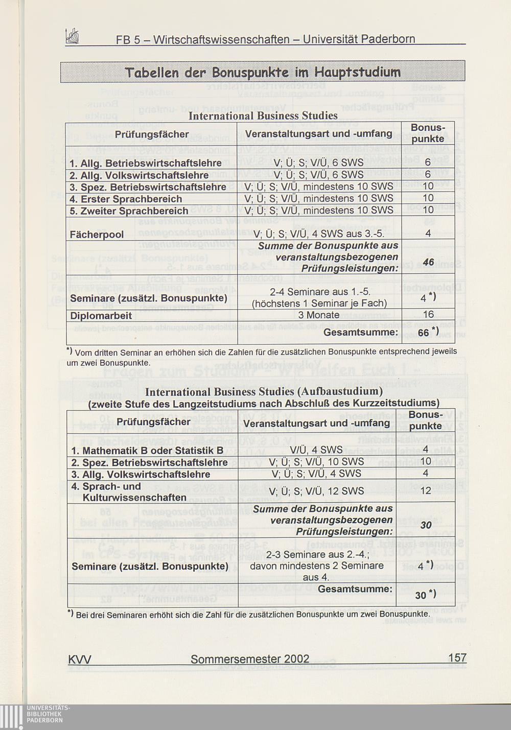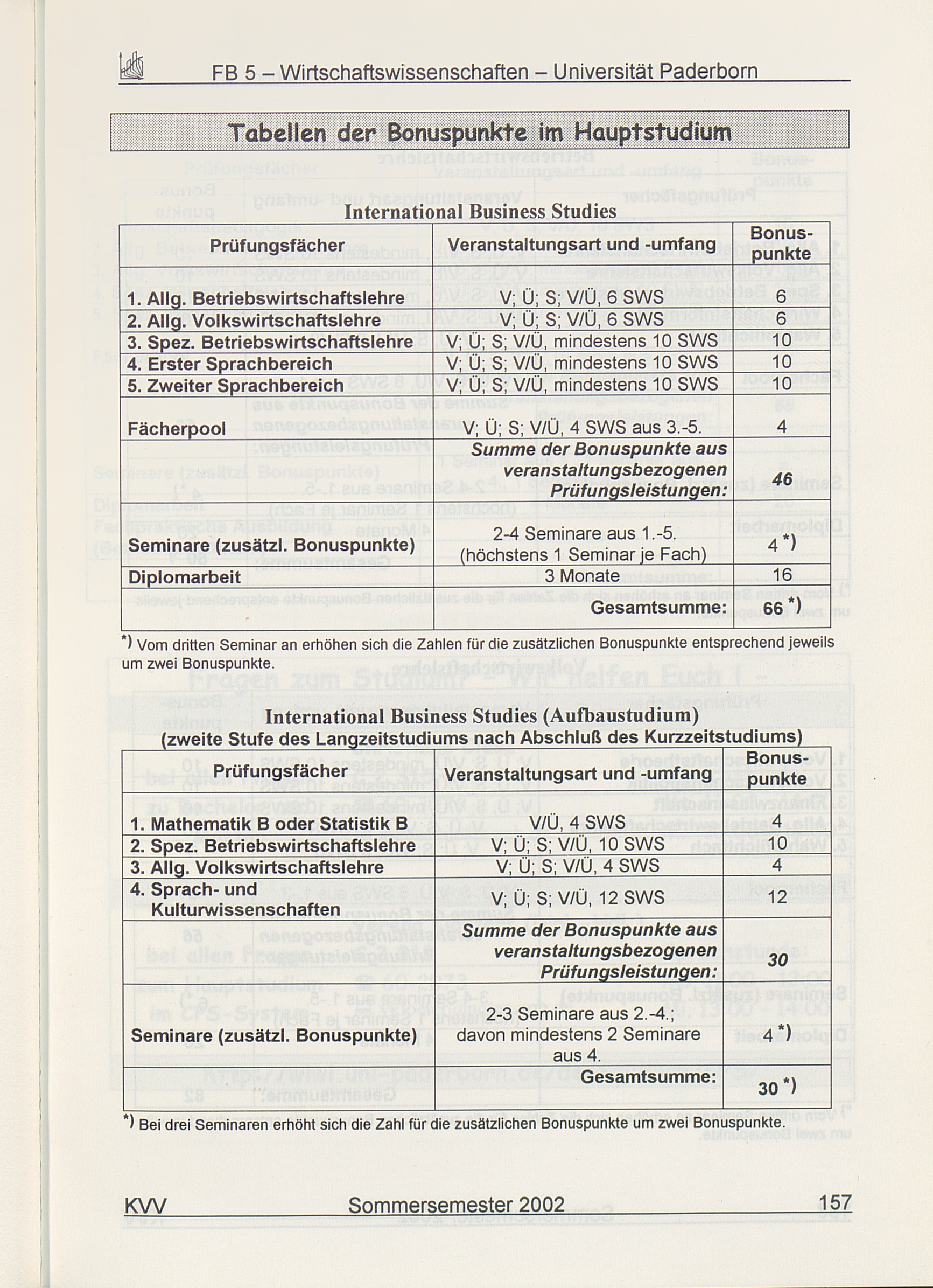 Tabellen der Bonuspunkte im Hauptstudium