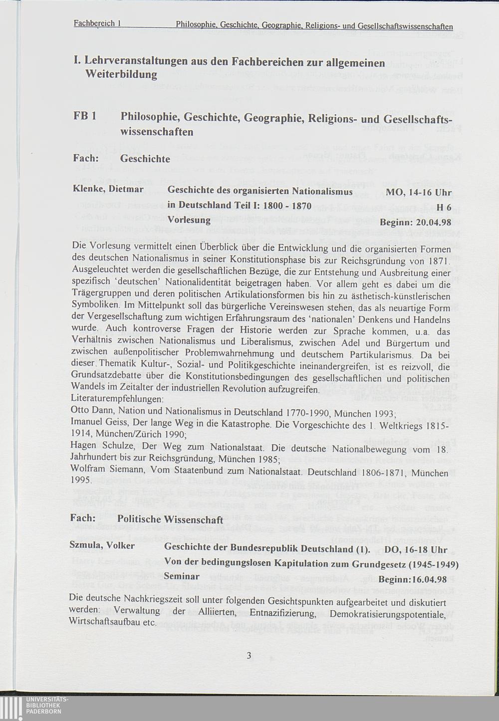 I. Lehrveranstaltungen aus den Fachbereichen zur allgemeinen Weiterbildung