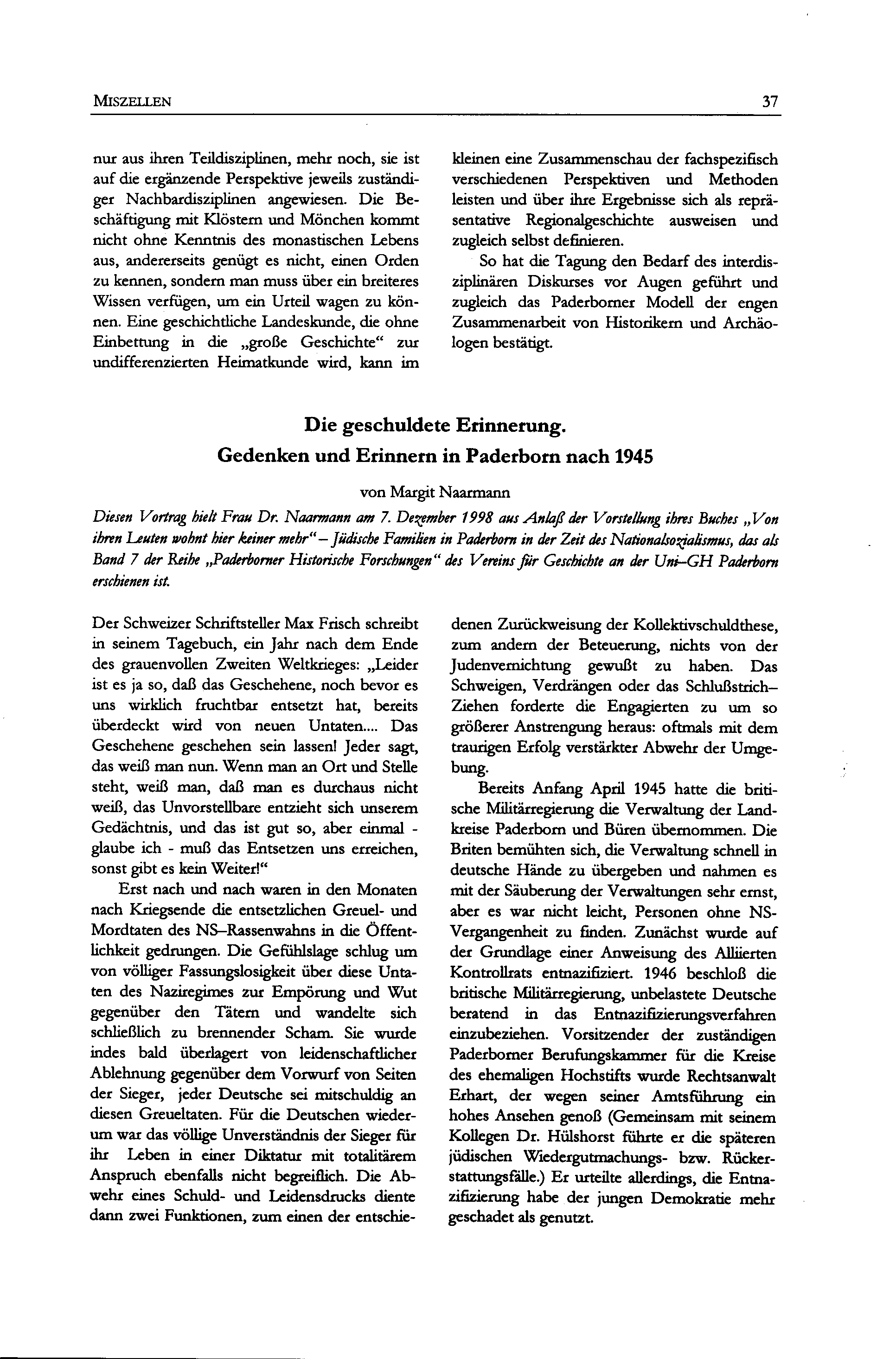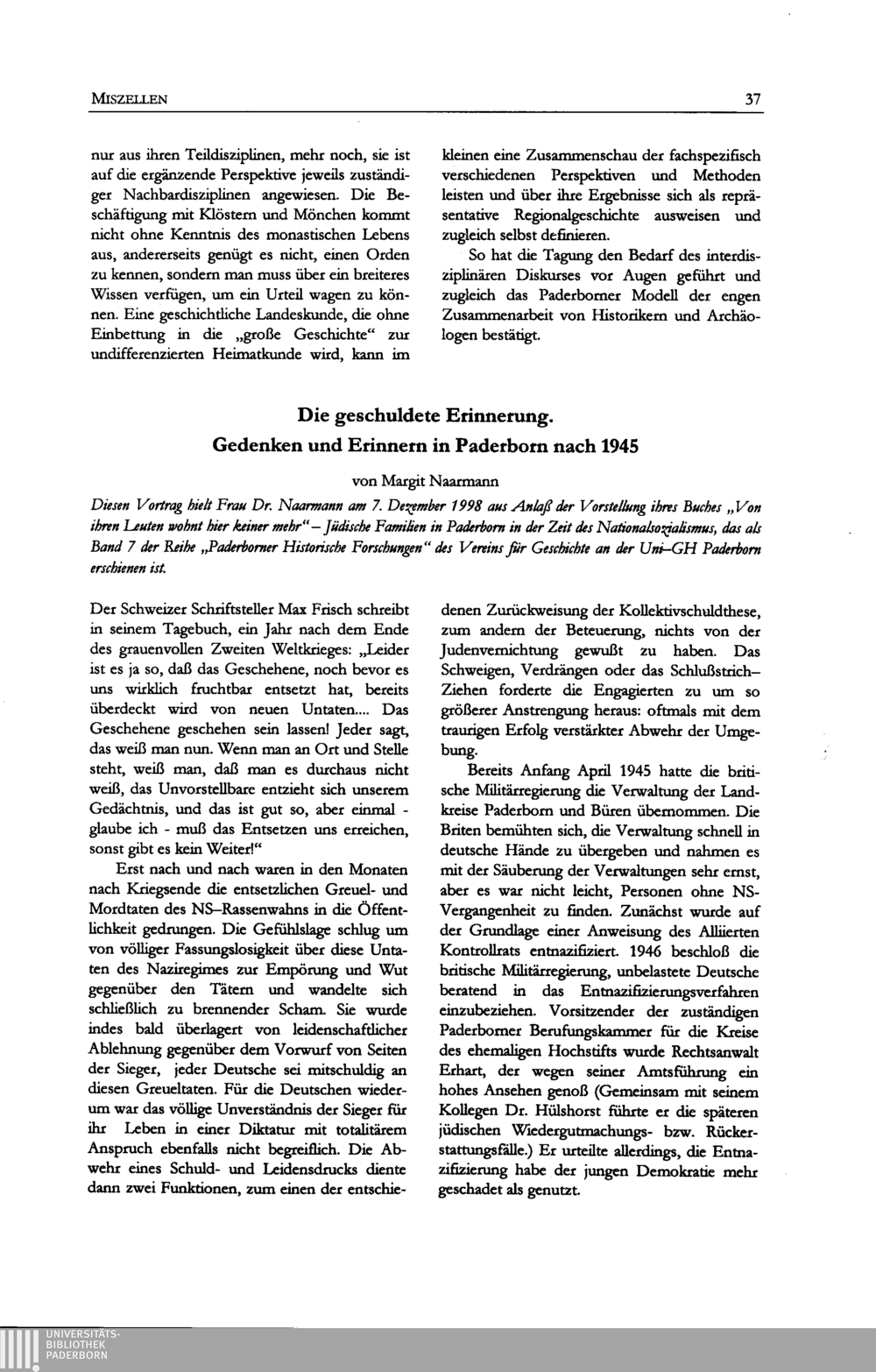 Margit Naarmann, Die geschuldete Erinnerung. Gedenken und Erinnern in Paderborn nach[...]