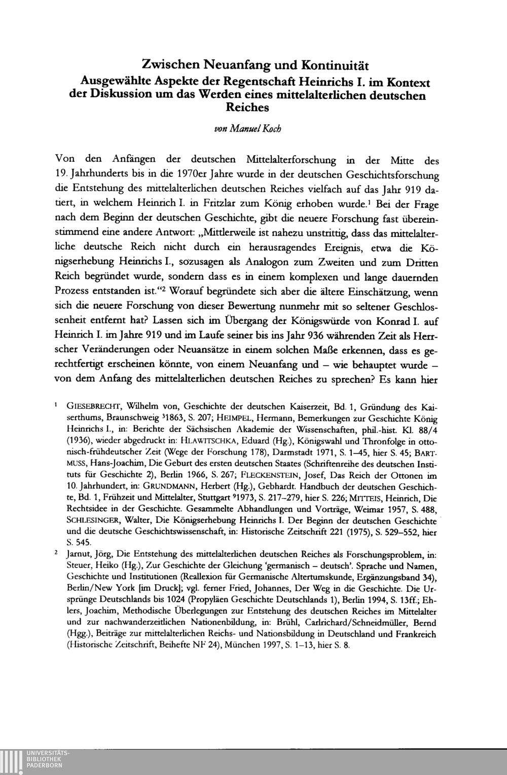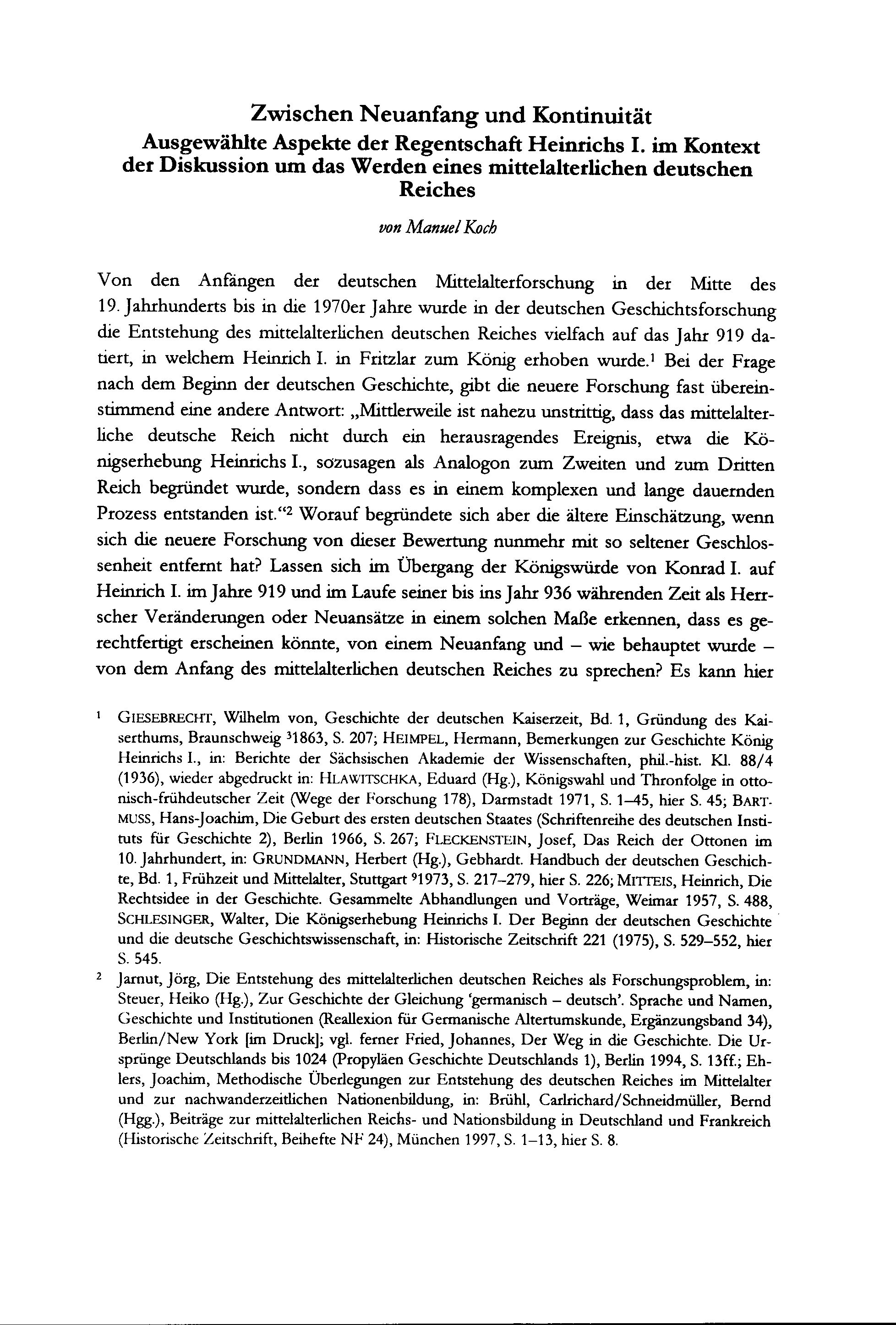 Manuel Koch, Zwischen Neuanfang und Kontinuität. Ausgewählte Aspekte der Regentschaft Heinrichs I. im Kontext der Diskussion um das Werden eines mittelalterlichen deutschen Reiches