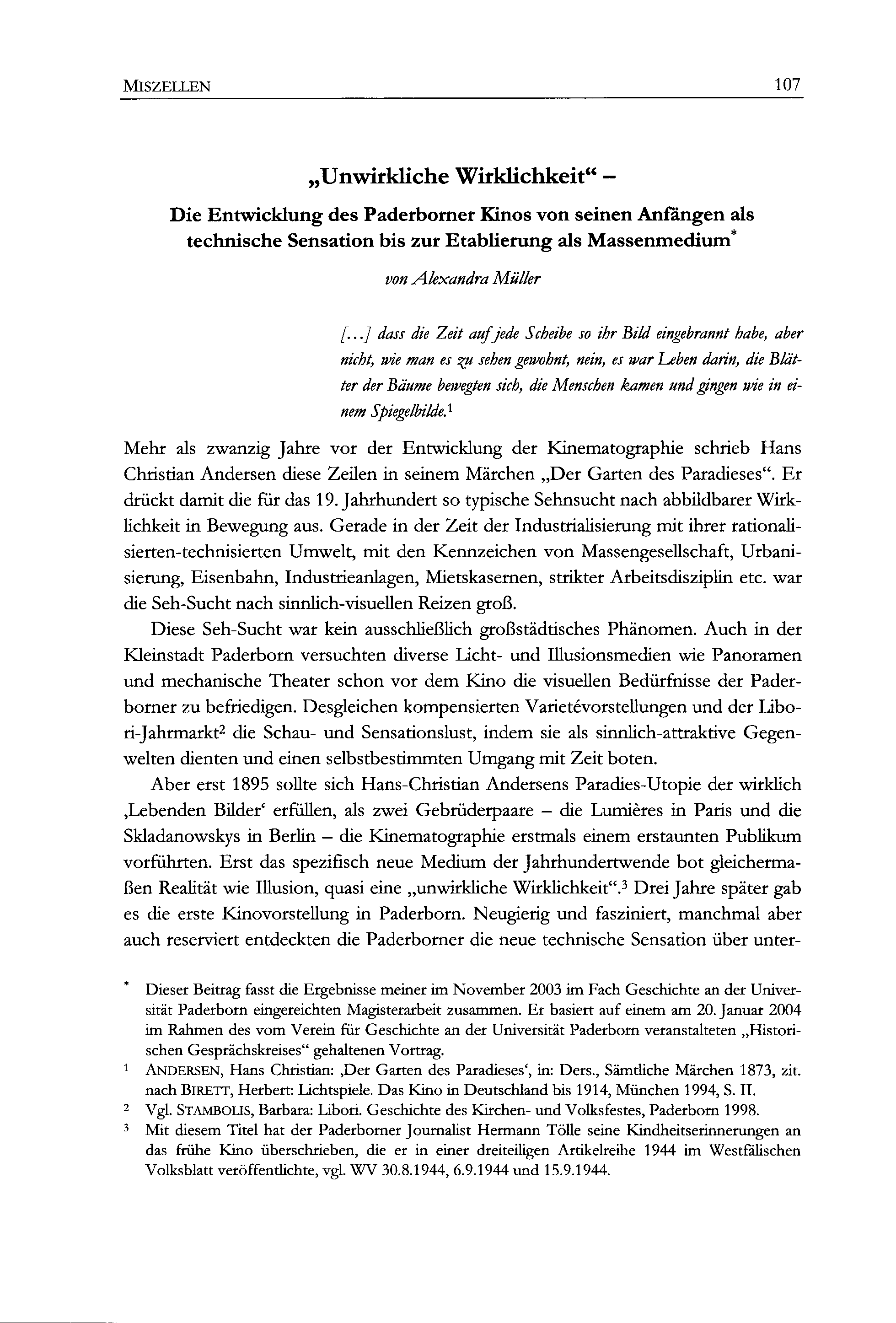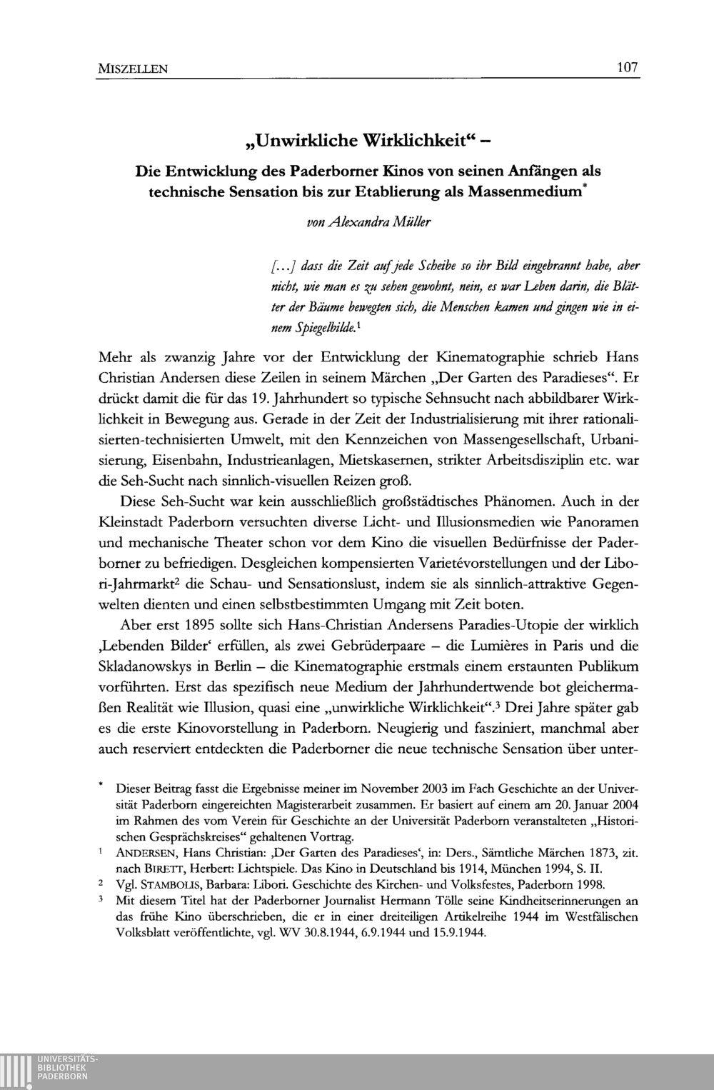 Alexandra Müller, "Unwirkliche Wirklichkeit" - Die Entwicklung des Paderborner Kinos von seinen Anfängen als technische Sensation bis zur Etablierung als Massenmedium