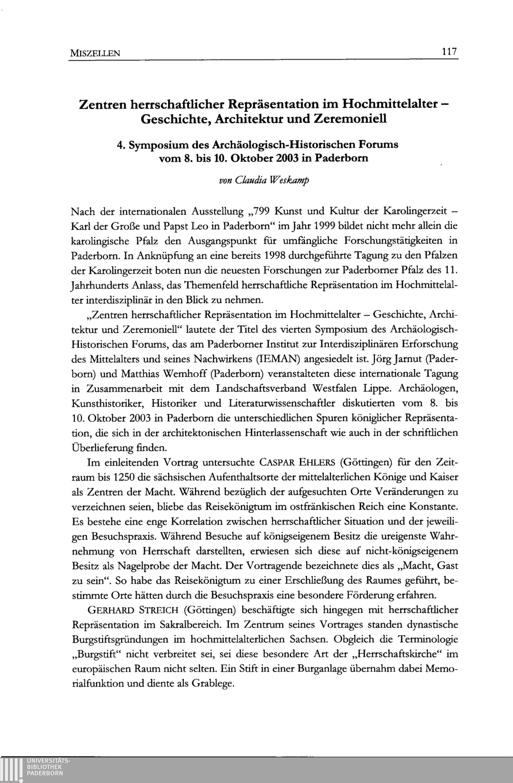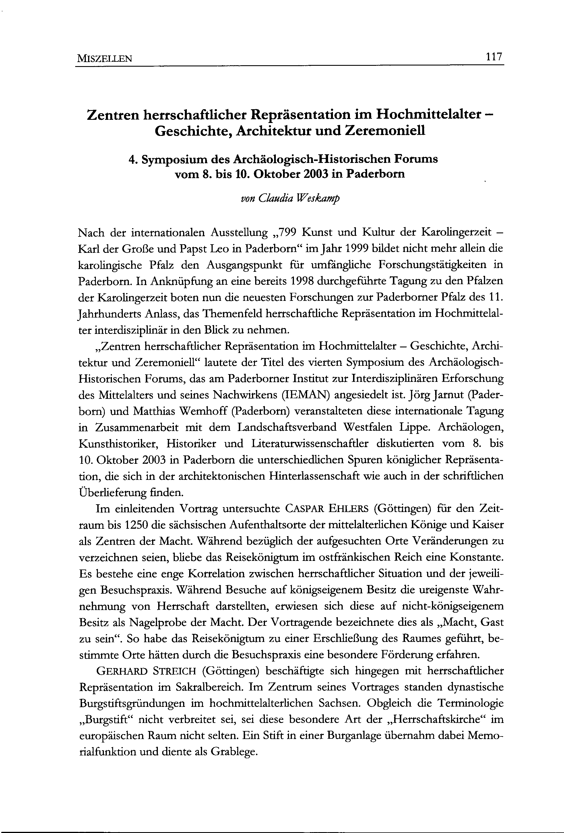 Claudia Weskamp, Zentren herrschaftlicher Repräsentation im Hochmittelalter - Geschichte, Architektur und Zeremoniell. 4. Symposium des Archäologisch-Historischen Forums vom 8. bis 10. Oktober 2003 in Paderborn