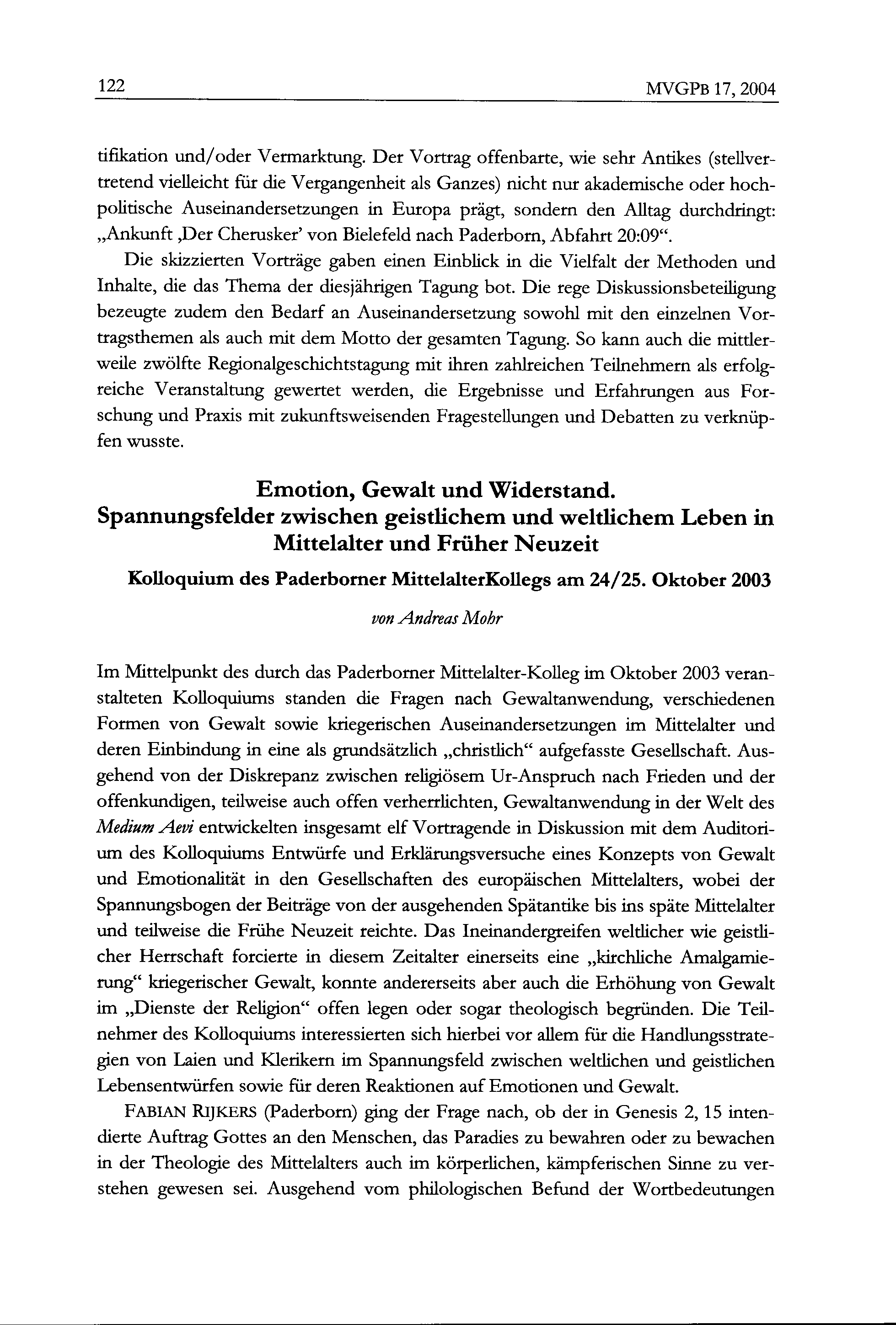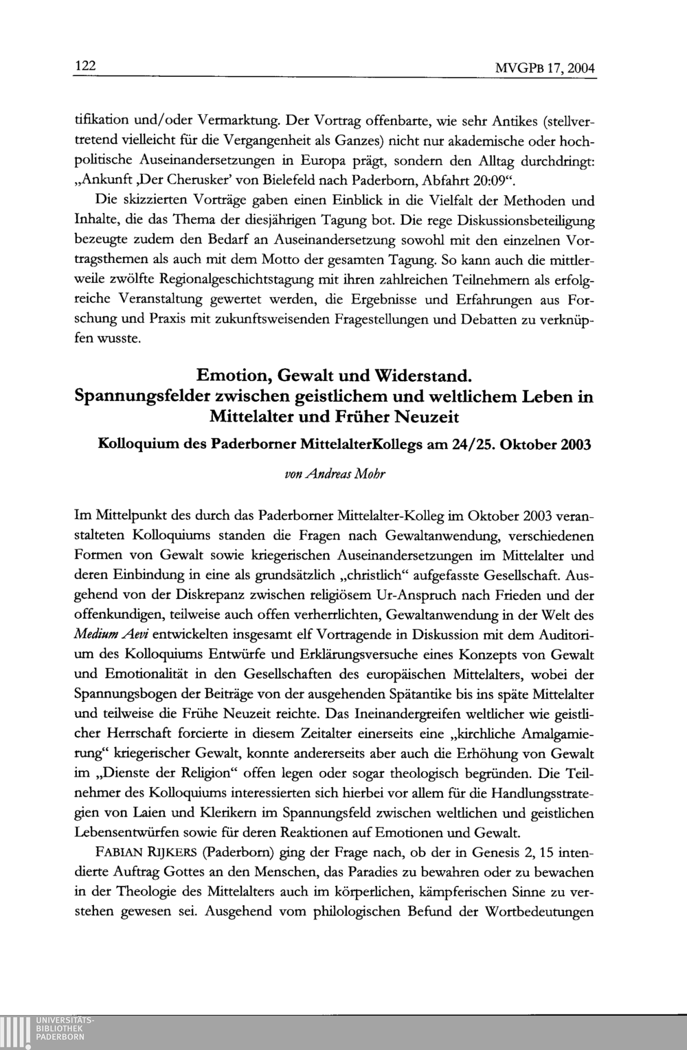 Andreas Mohr, Emotion, Gewalt und Widerstand. Spannungsfelder zwischen geistlichem und weltlichem Leben in Mittelalter und Früher Neuzeit. Kolloquium des Paderborner MittelalterKollegs am 24./25. Oktober 2003