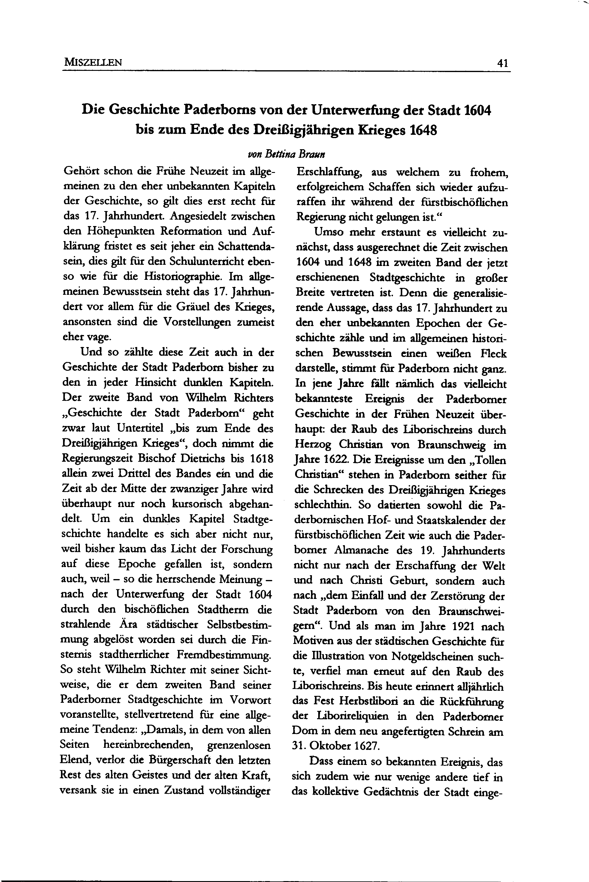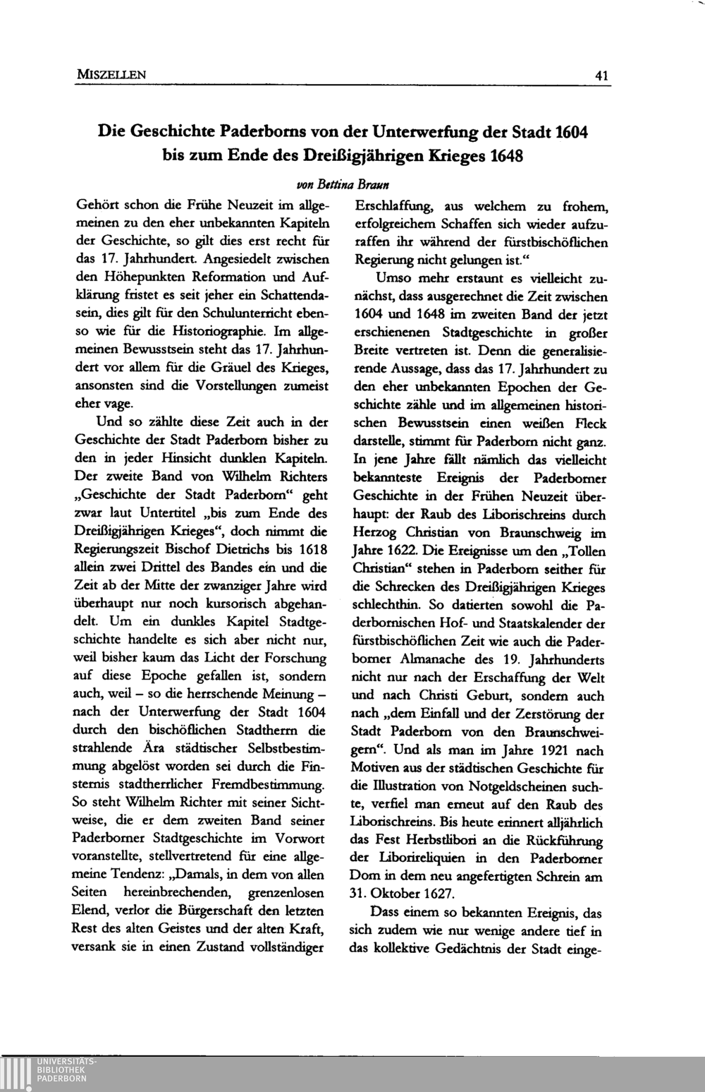 Bettina Braun, Die Geschichte Paderborns vor der Unterwerfung der Stadt 1604 bis zum Ende des Dreißigjährigen Krieges 1648