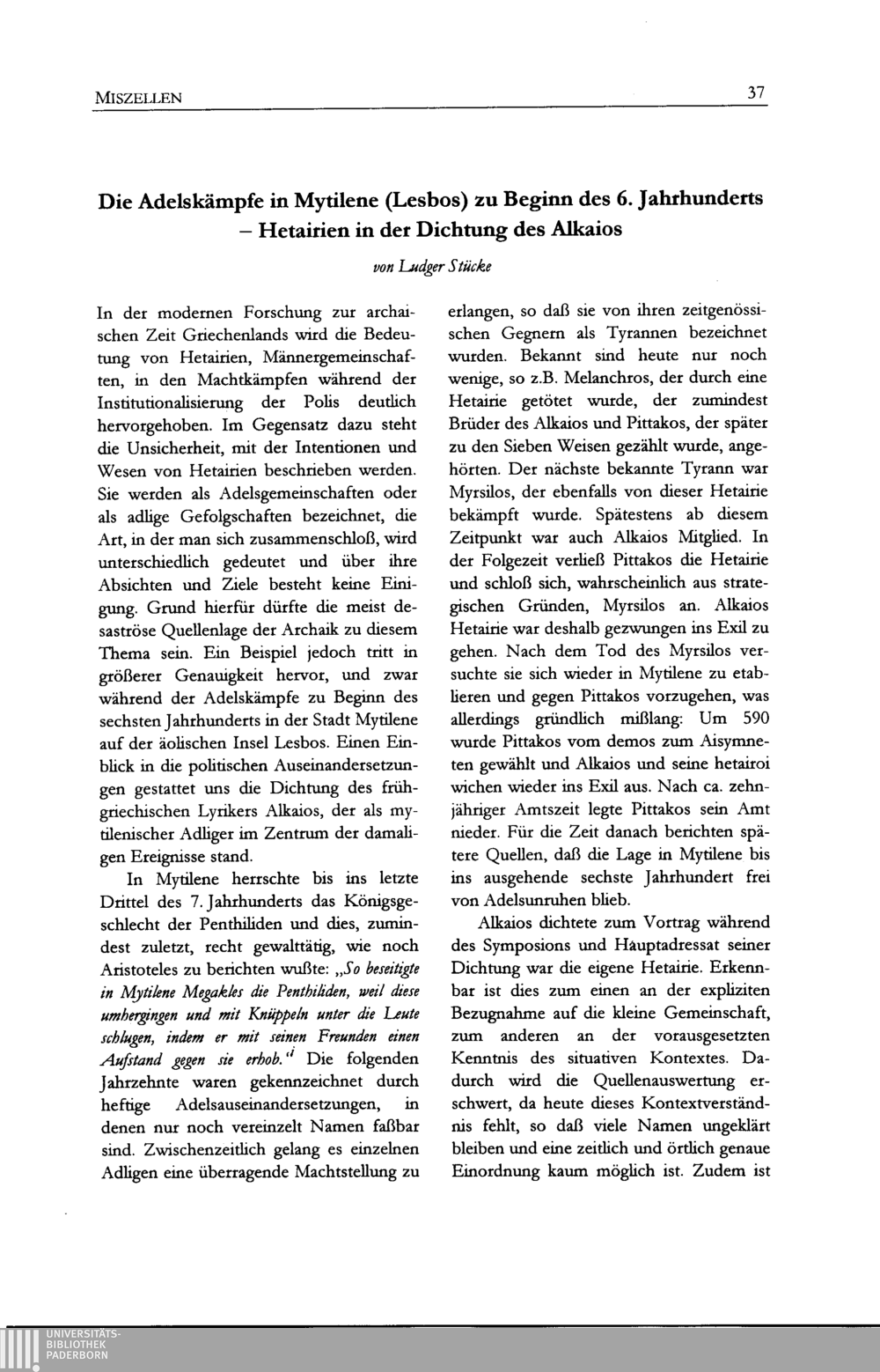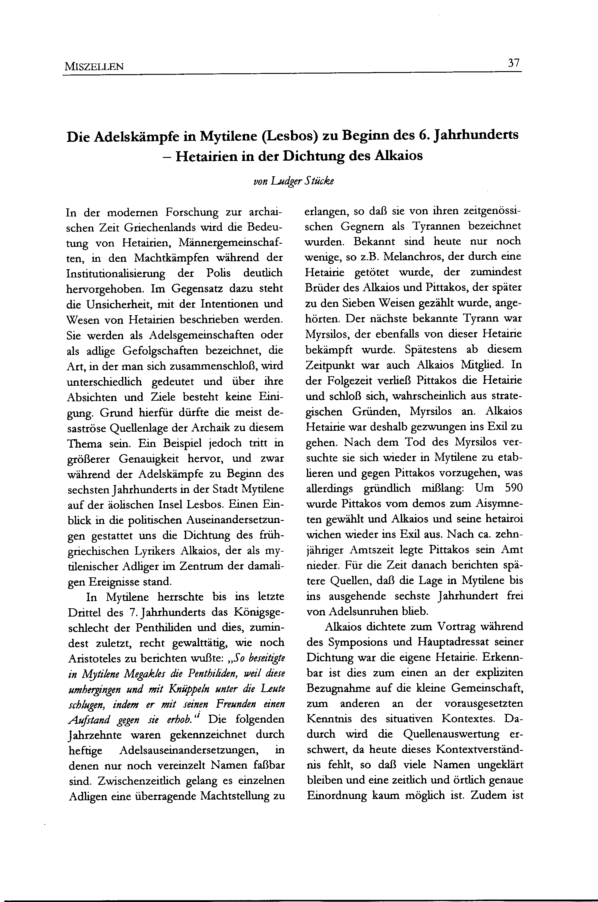 Ludger Stücke, Die Adelskämpfe in Mytilene (Lesbos) zu Beginn des 6. Jahrhunderts - Hetairien in der Dichtung des Alkaios