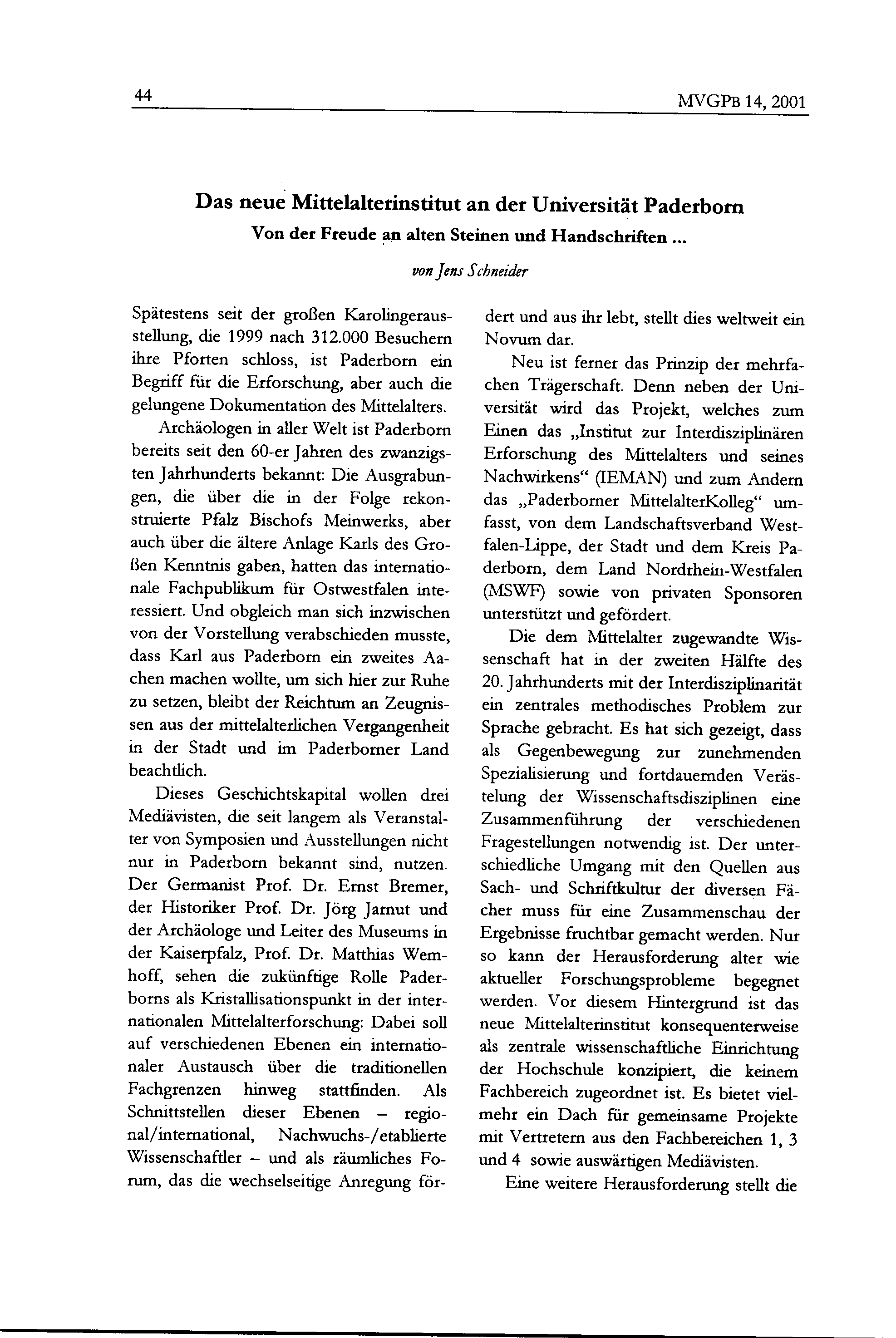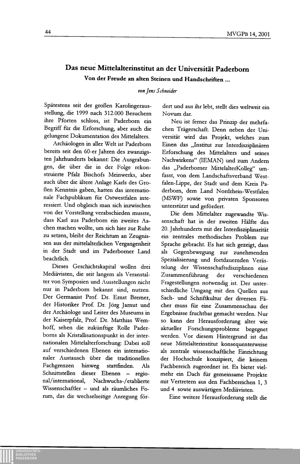 Jens Schneider, Das neue Mittelalterinstitut an der Universität Paderborn. Von der Freude an alten Steinen und Handschriften