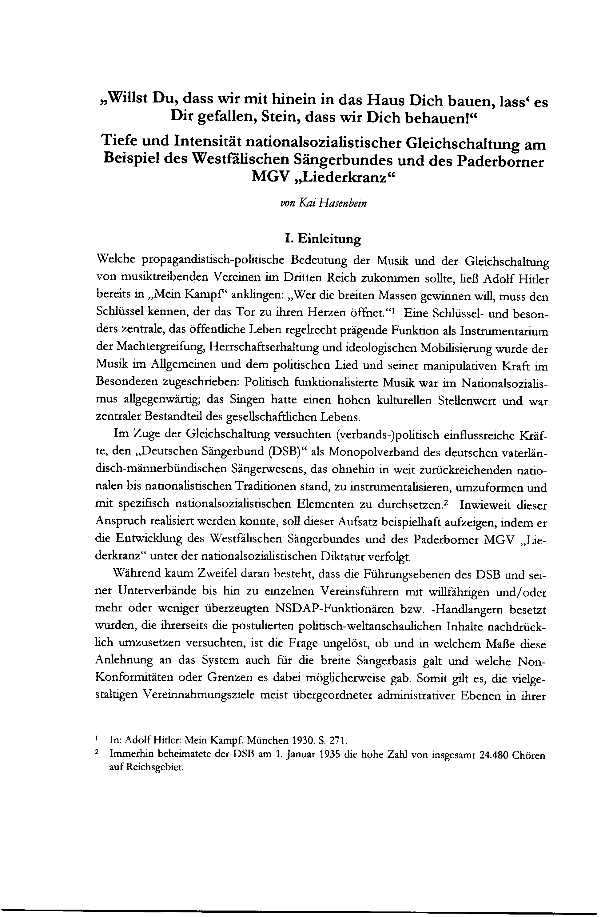 Kai Hasenbein, "Willst Du, dass wir mit hinein in das Haus Dich bauen, lass' es Dir gefallen, Stein, dass wir Dich behauen!" Tiefe und Intensität nationalsozialistischer Gleichschaltung am Beispiel des Westfälischen Sängerbundes und des Paderborner MGV "Liederkranz"