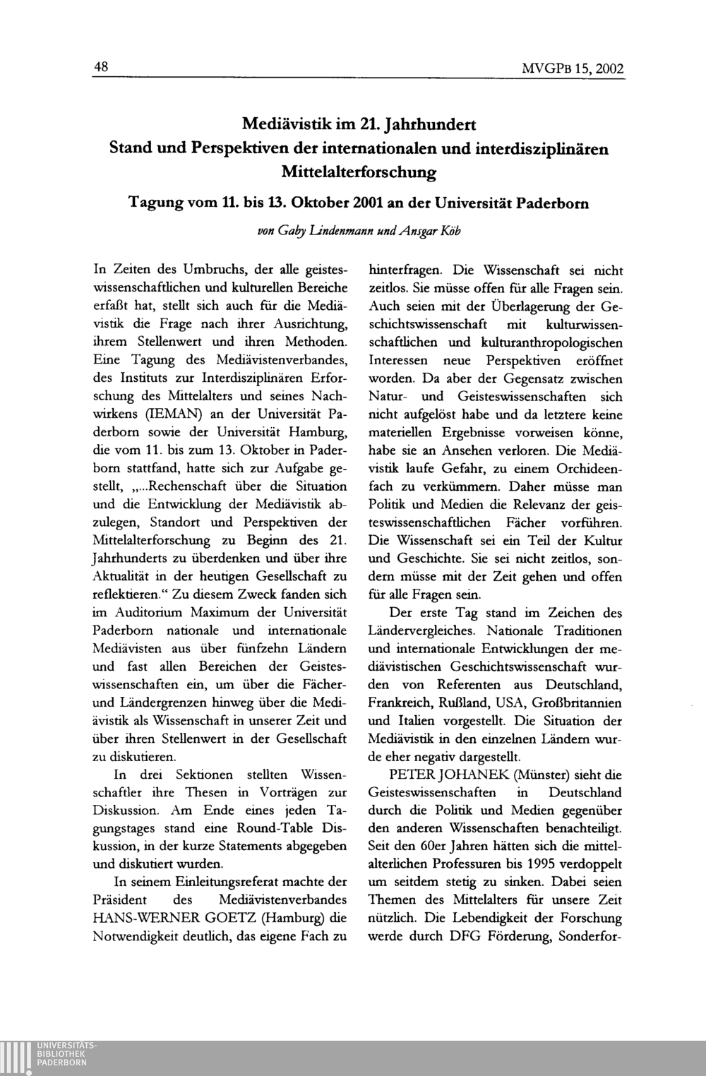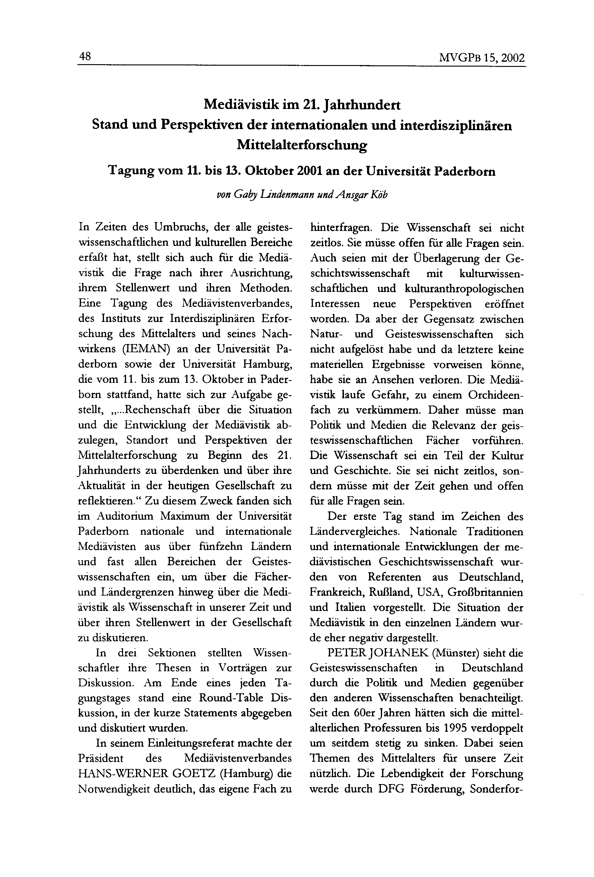 Gaby Lindenmann und Ansgar Köb, Mediävistik im 21. Jahrhundert. Stand und Perspektiven[...]