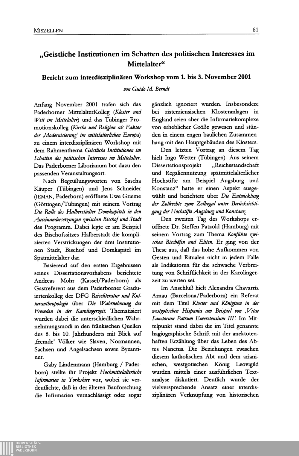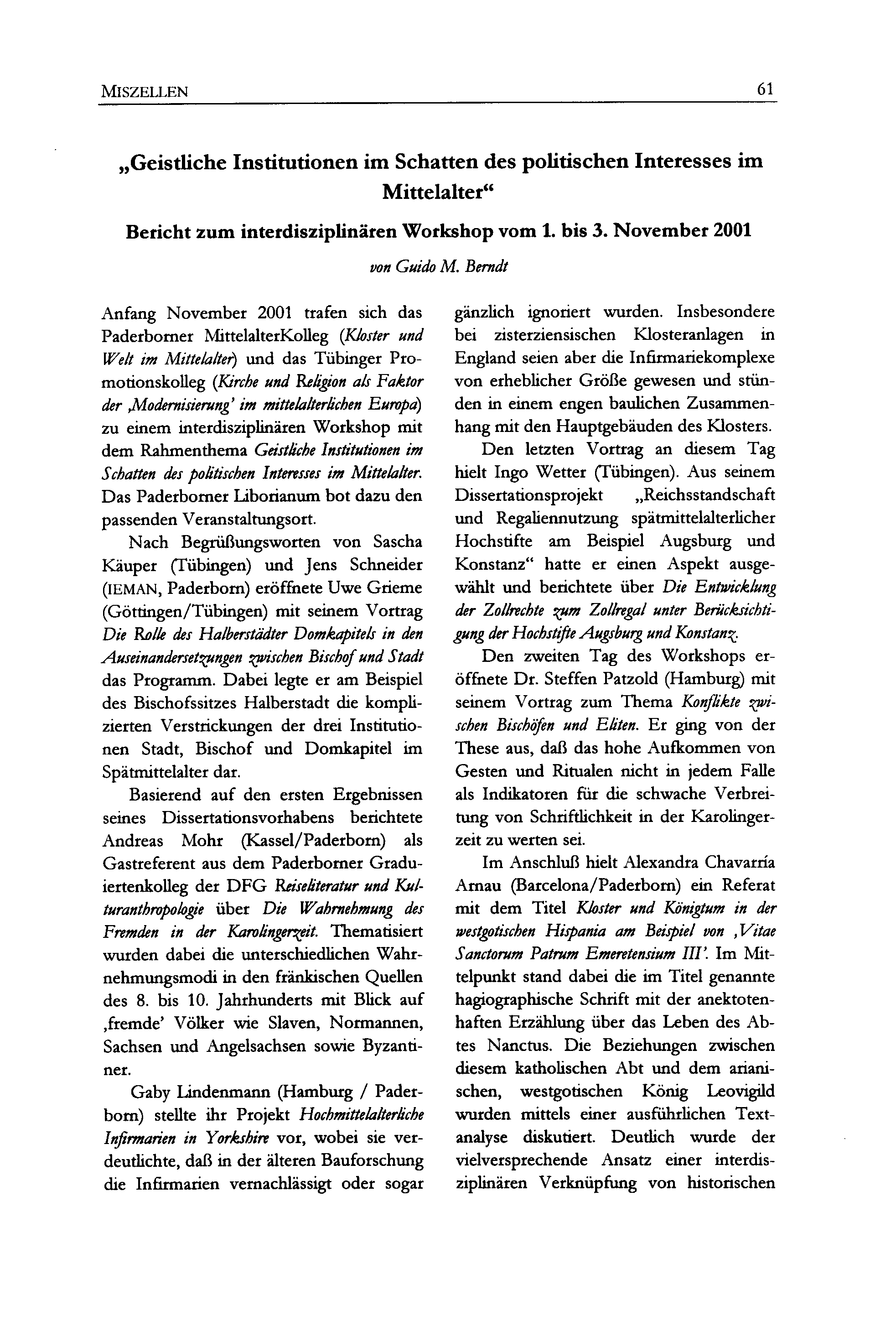Guido M. Berndt, "Geistliche Institutionen im Schatten des politischen Interesses im Mittelalter". Bericht zum interdisziplinären Workshop vom 1. bis 3. November 2001