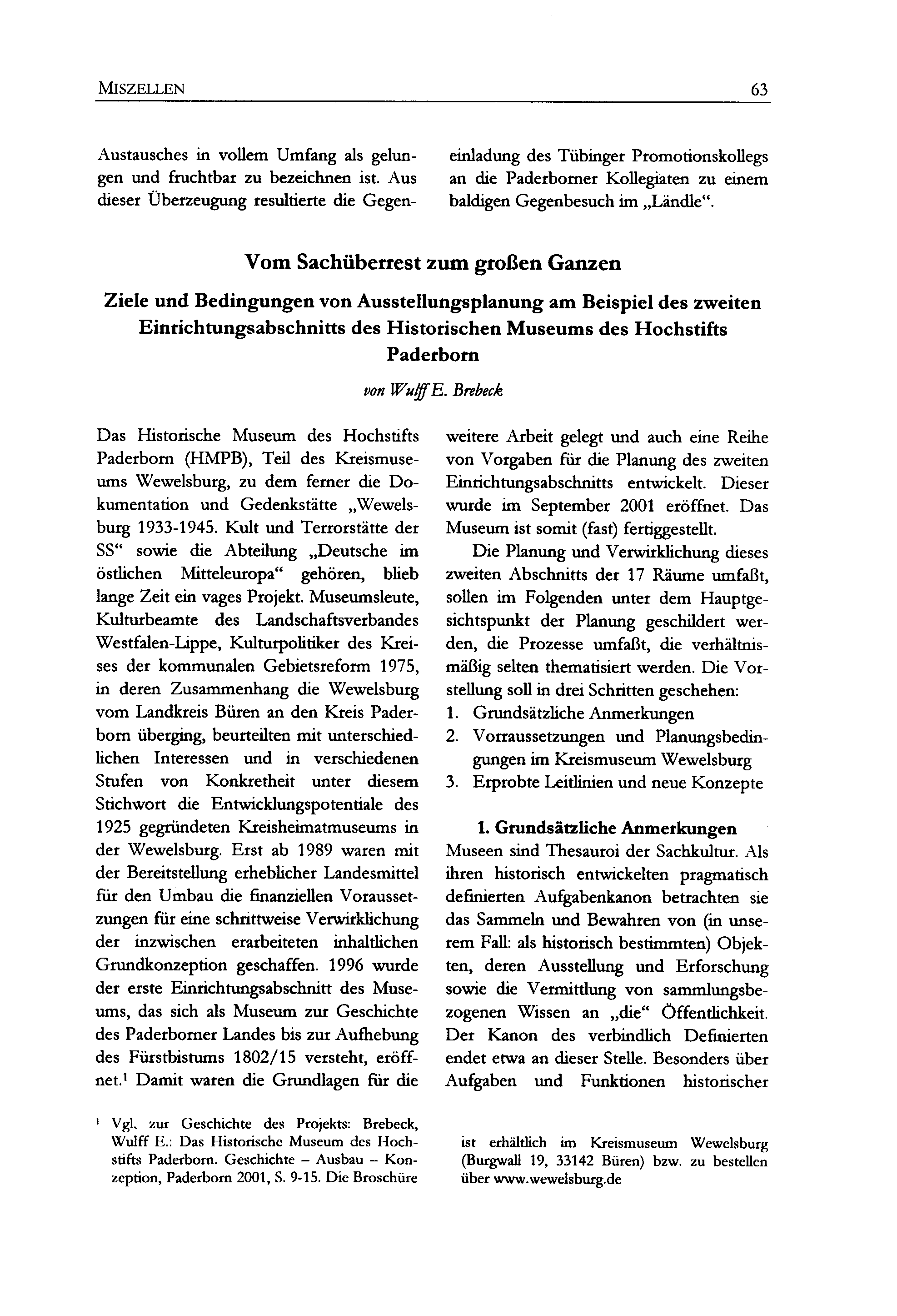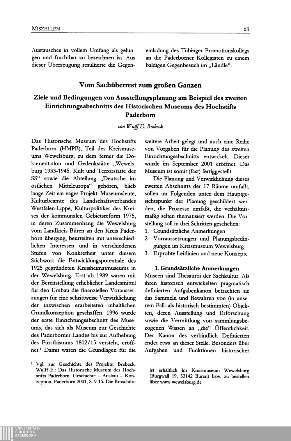 Wulff E. Brebeck, Vom Sachüberrest zum großen Ganzen - Ziele und Bedingungen von Ausstellungsplanung am Beispiel des zweiten Einrichtungsabschnitts des Historischen Museums des Hochstifts Paderborn