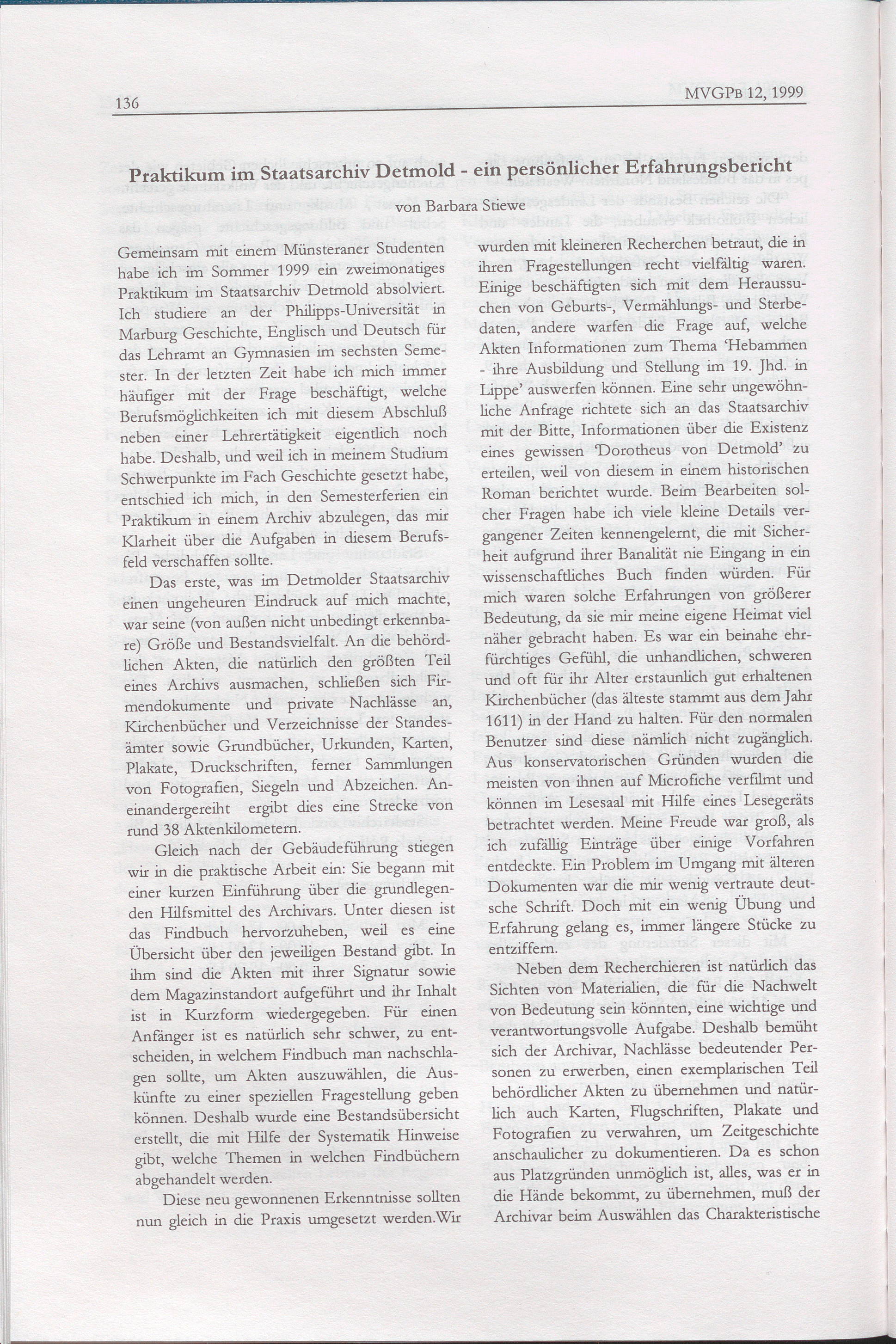 Barbara Stiewe, Praktikum im Staatsarchiv Detmold - ein persönlicher Erfahrungsbericht