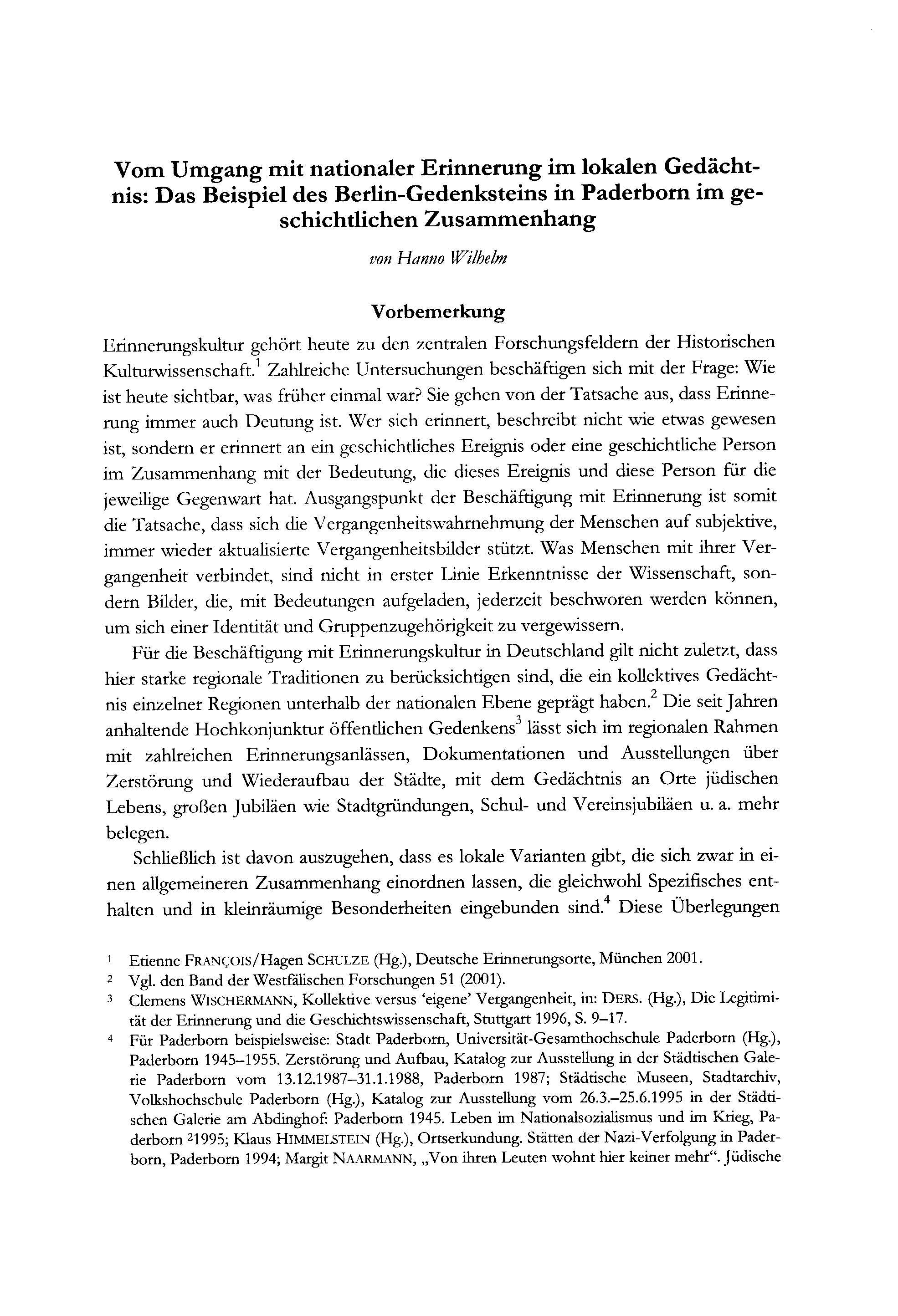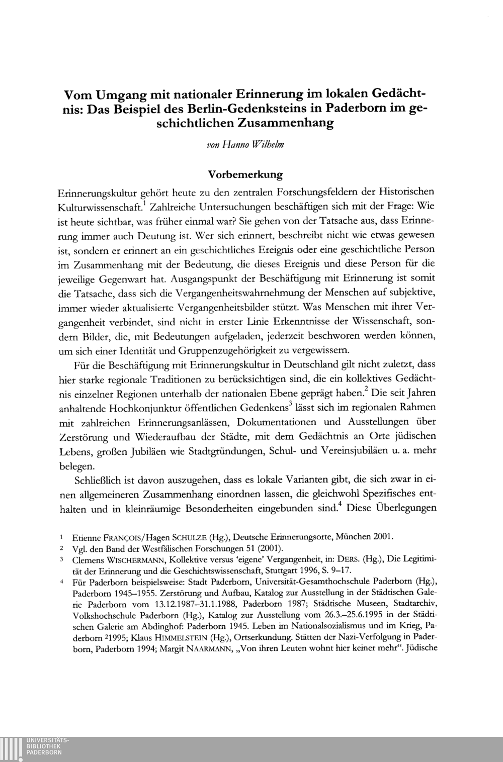 Hanno Wilhelm, Vom Umgang mit nationaler Erinnerung im lokalen Gedächtnis: Das Beispiel des Berlin-Gedenksteins in Paderborn im geschichtlichen Zusammenhang. Mit einer Vorbemerkung von Barbara Stambolis