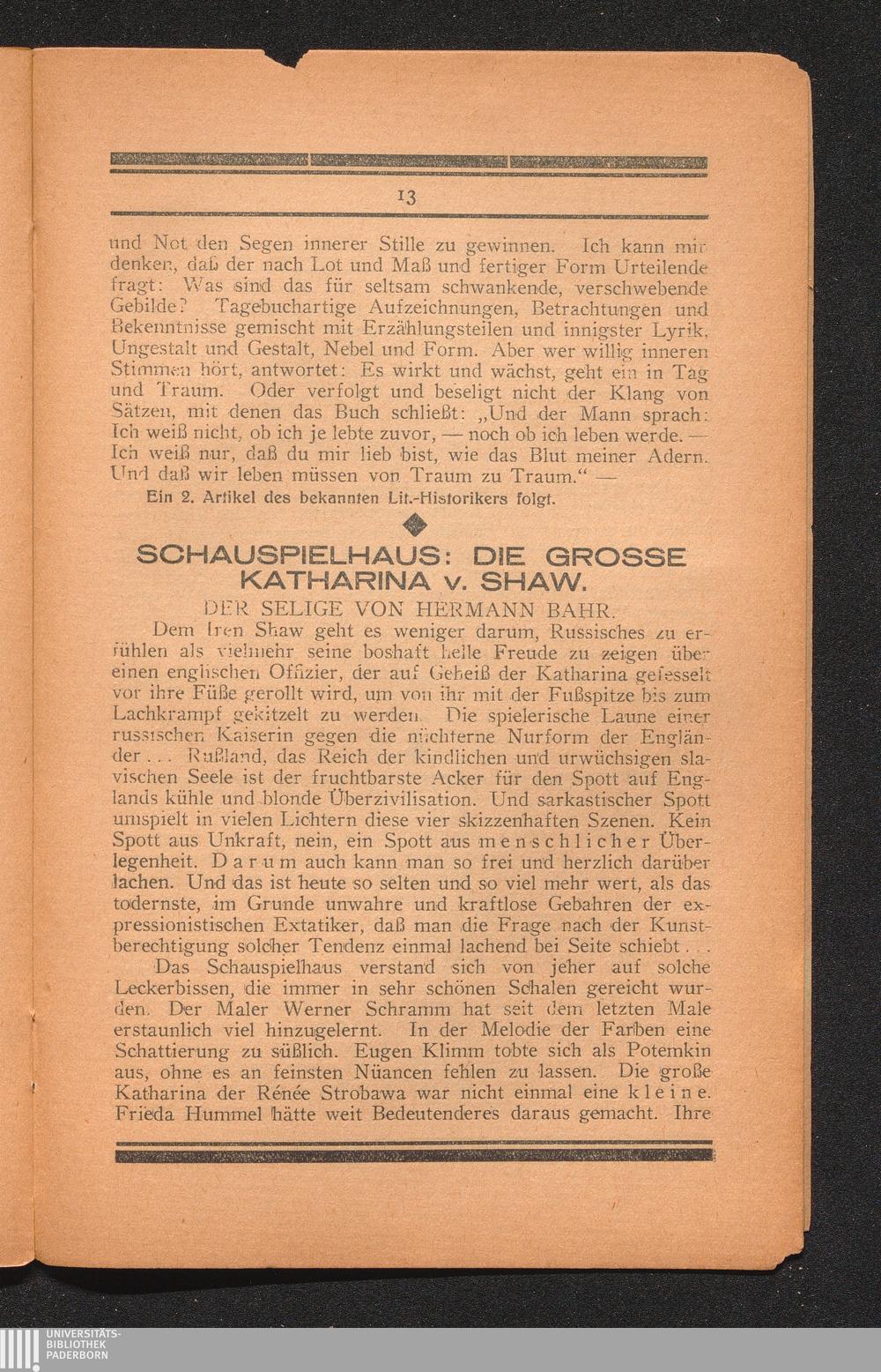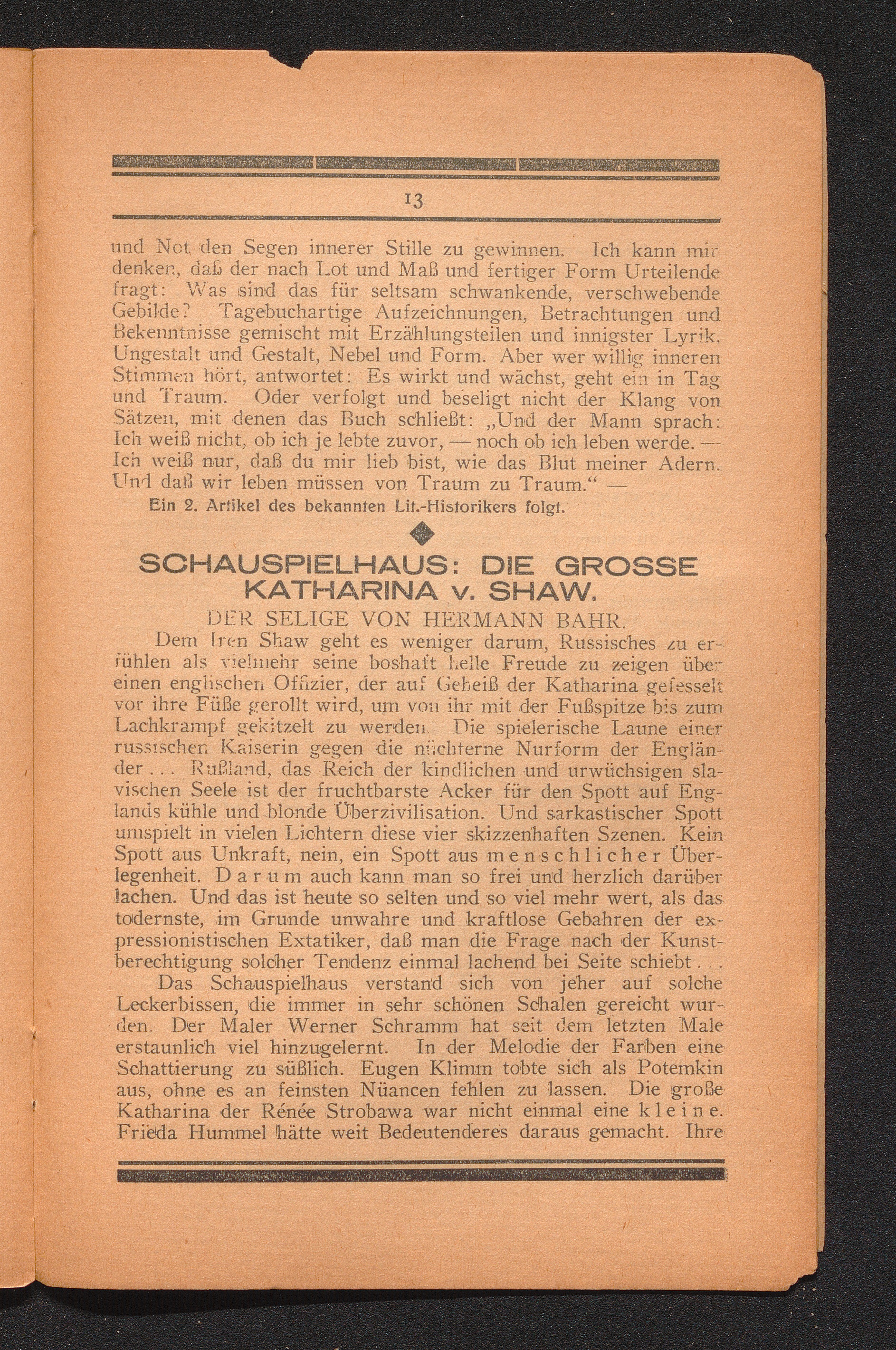 Schauspielhaus: Die Grosse Katharina v. Shaw. Der Selige Von Hermann Bahr.