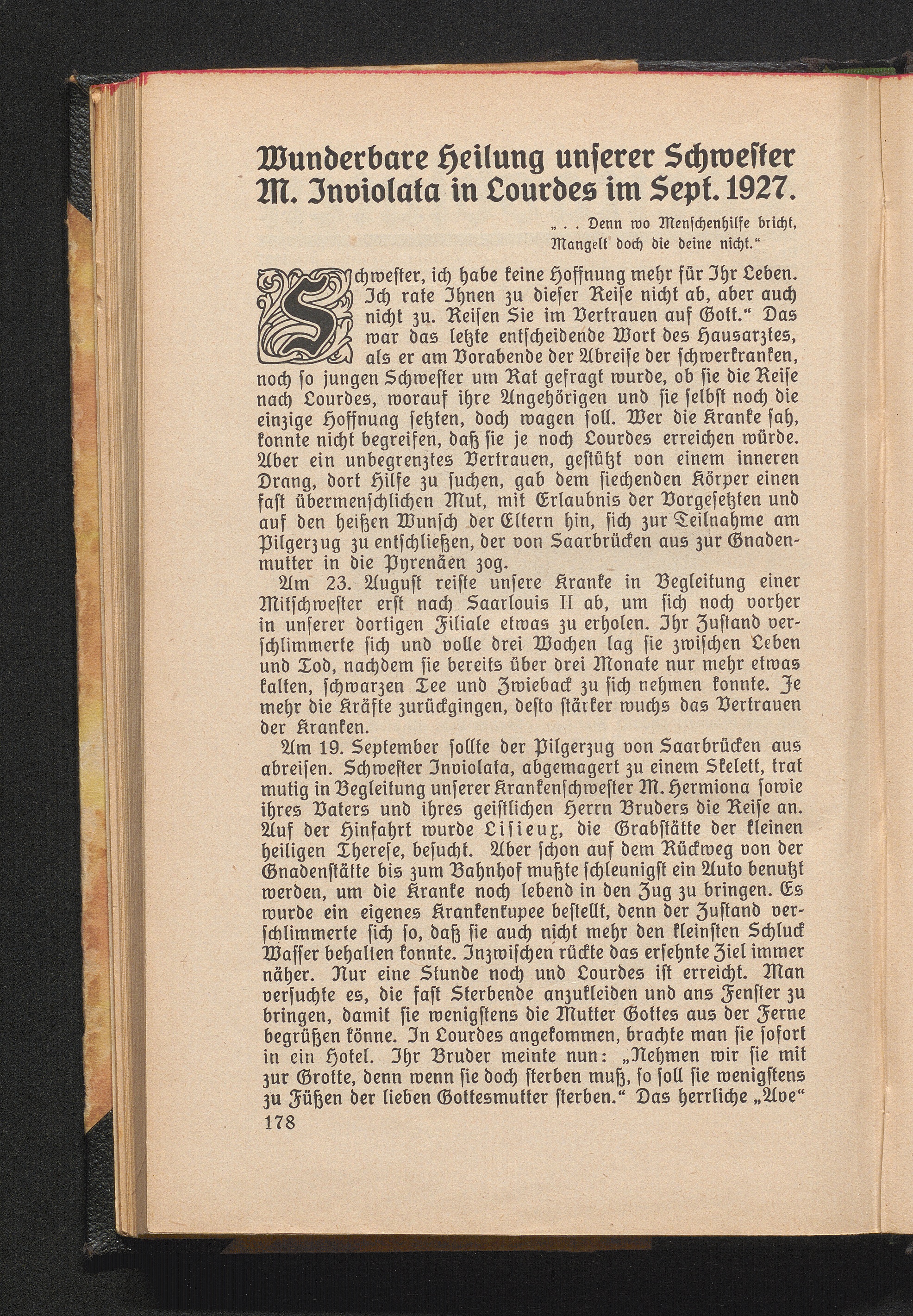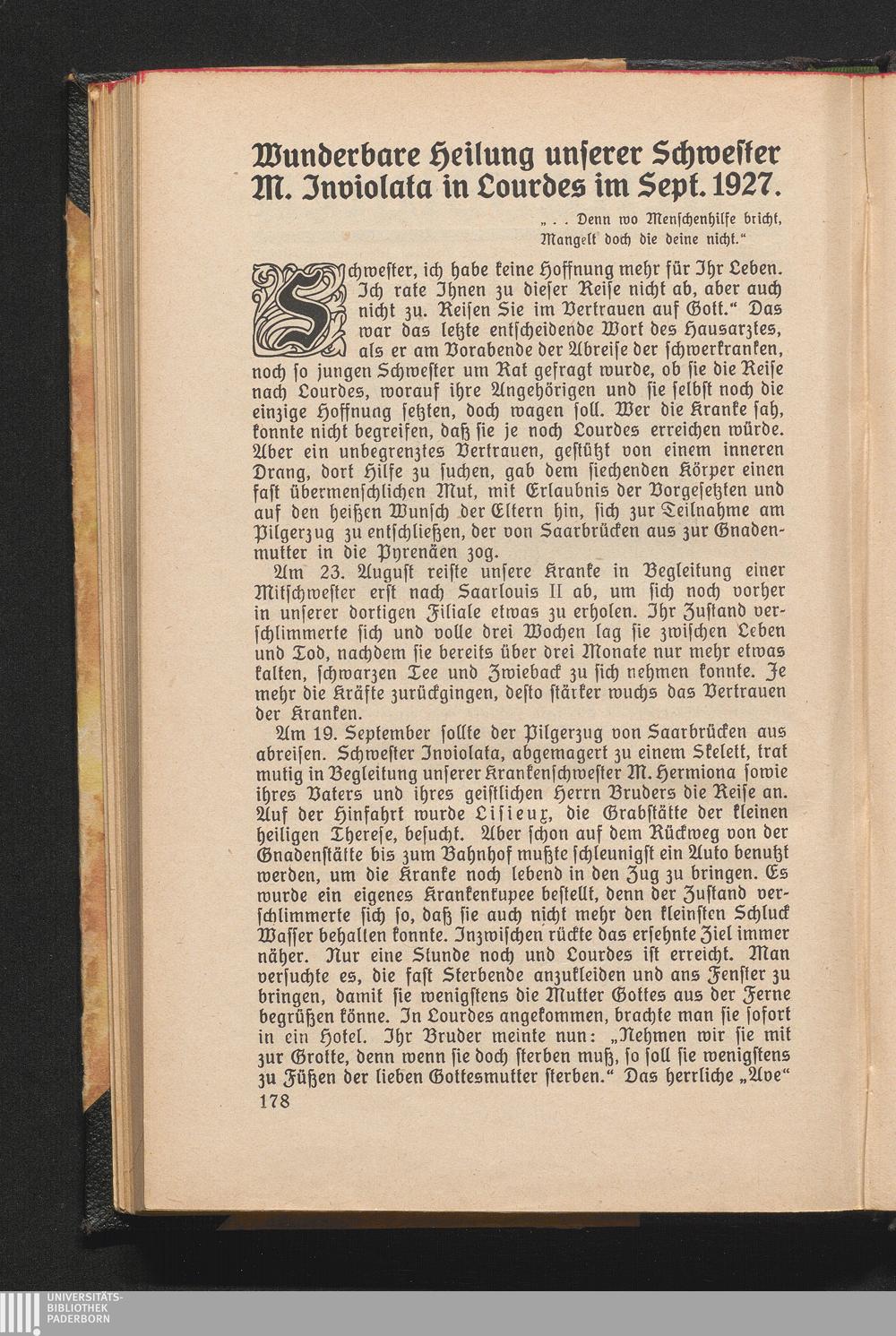 Wunderbare Heilung unserer Schwester M. Inviolata in Lourdes im Sept. 1927.