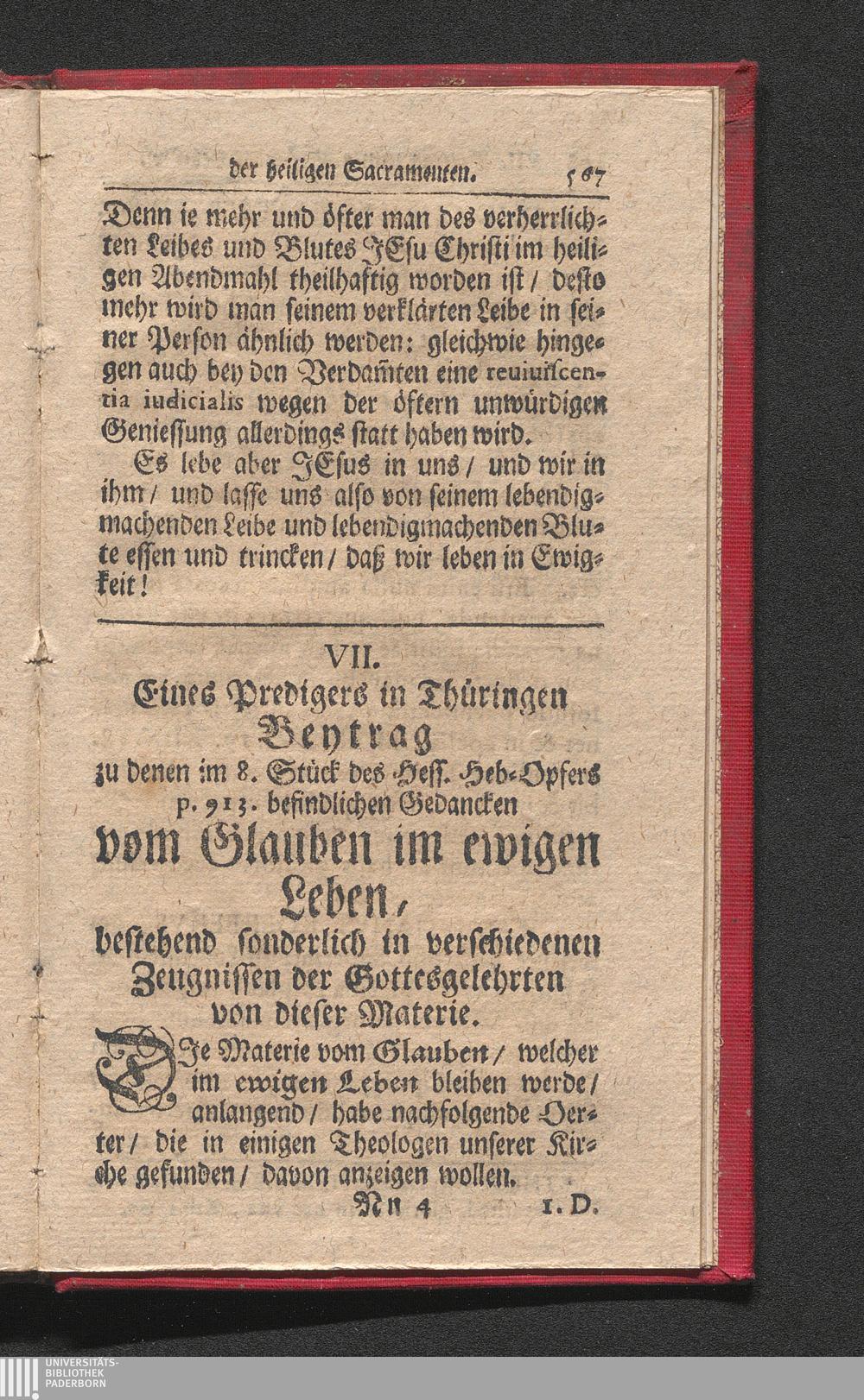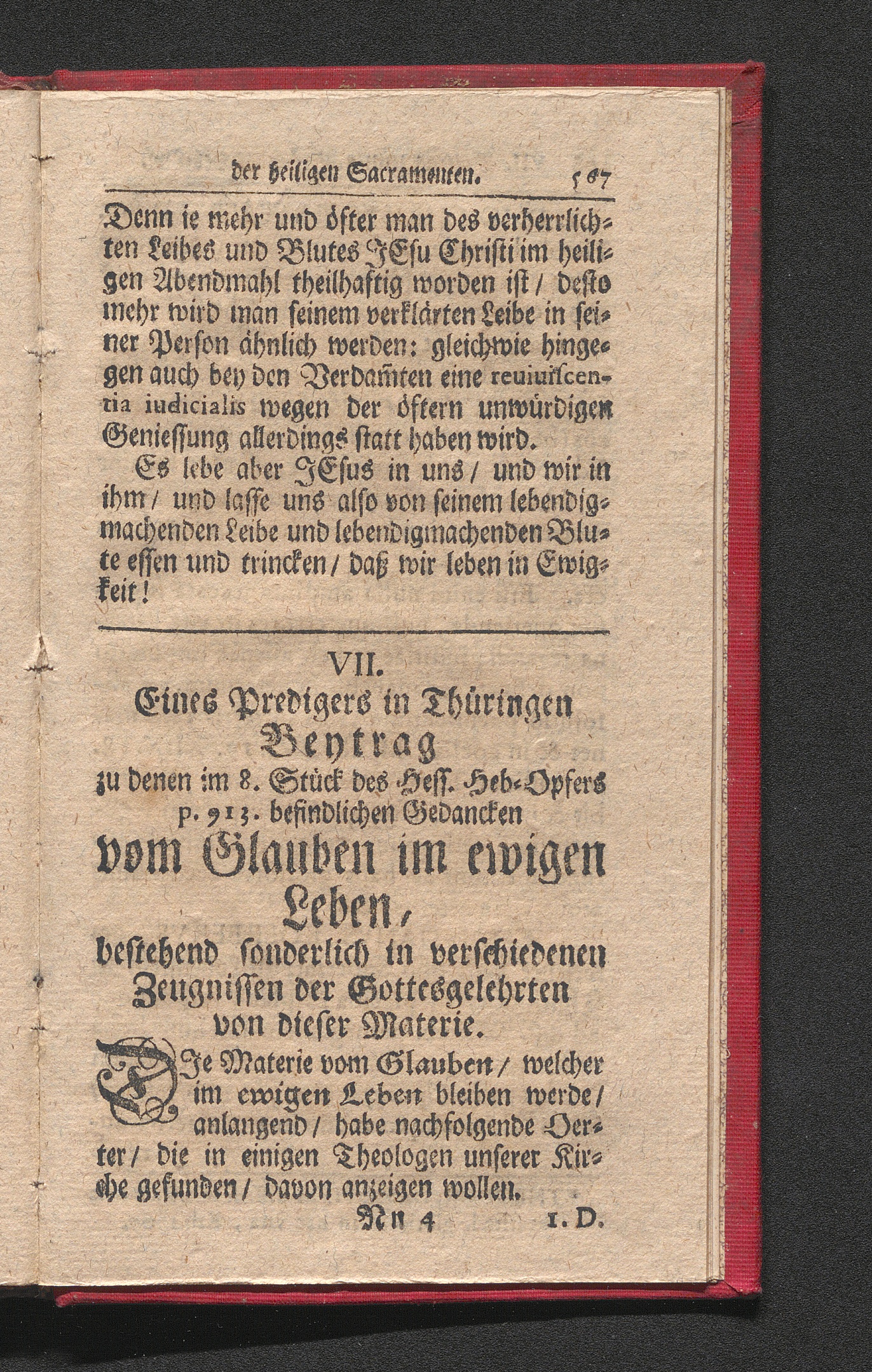 VII. Eines Predigers in Thüringen Beytrag zu denen im 8. Stück des Heßischen Heb-Opfers p. 913. befindlichen Gedancken vom Glauben im ewigen Leben/ bestehend sonderlich in verschiedenen Zeugnissen der Gottesgelehrten von dieser Materie.