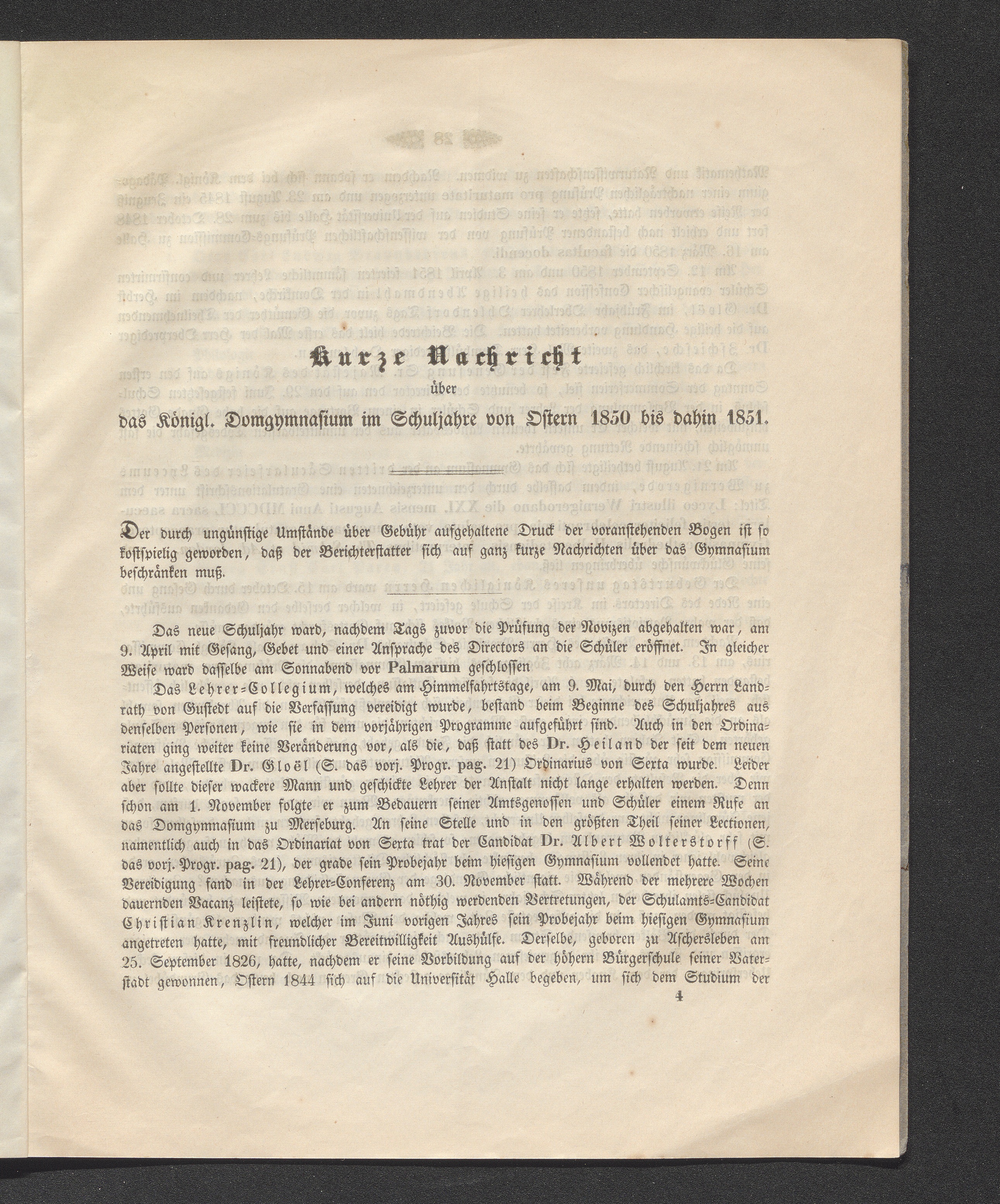 Kurze Nachricht über das Königl. Domgymnasium im Schuljahre von Ostern 1850 bis dahin 1851.