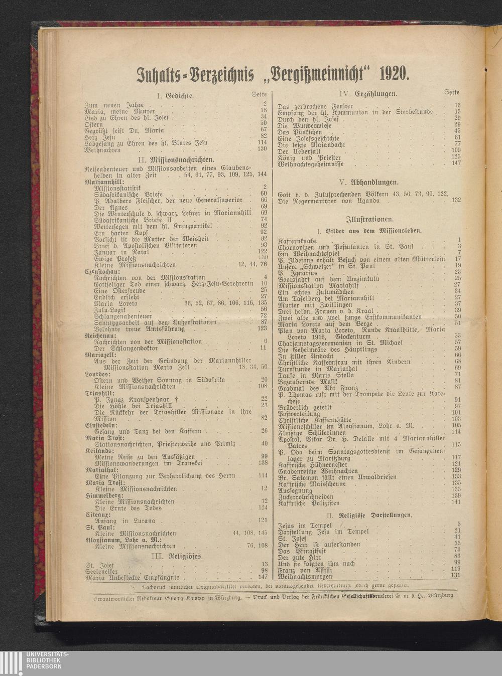 Jnhalts-Verzeichnis "Vergißmeinnicht" 1920.