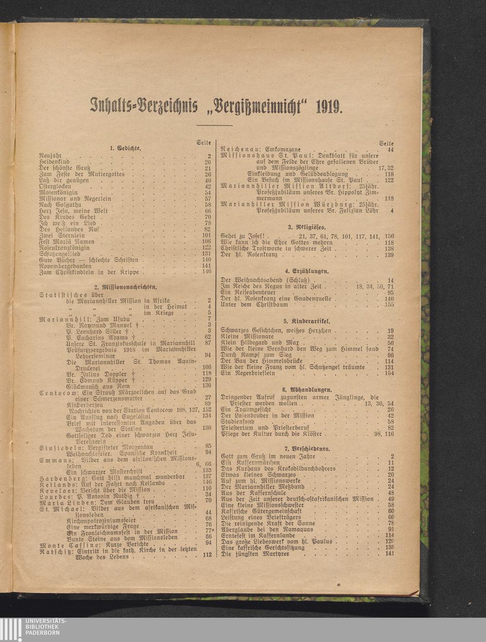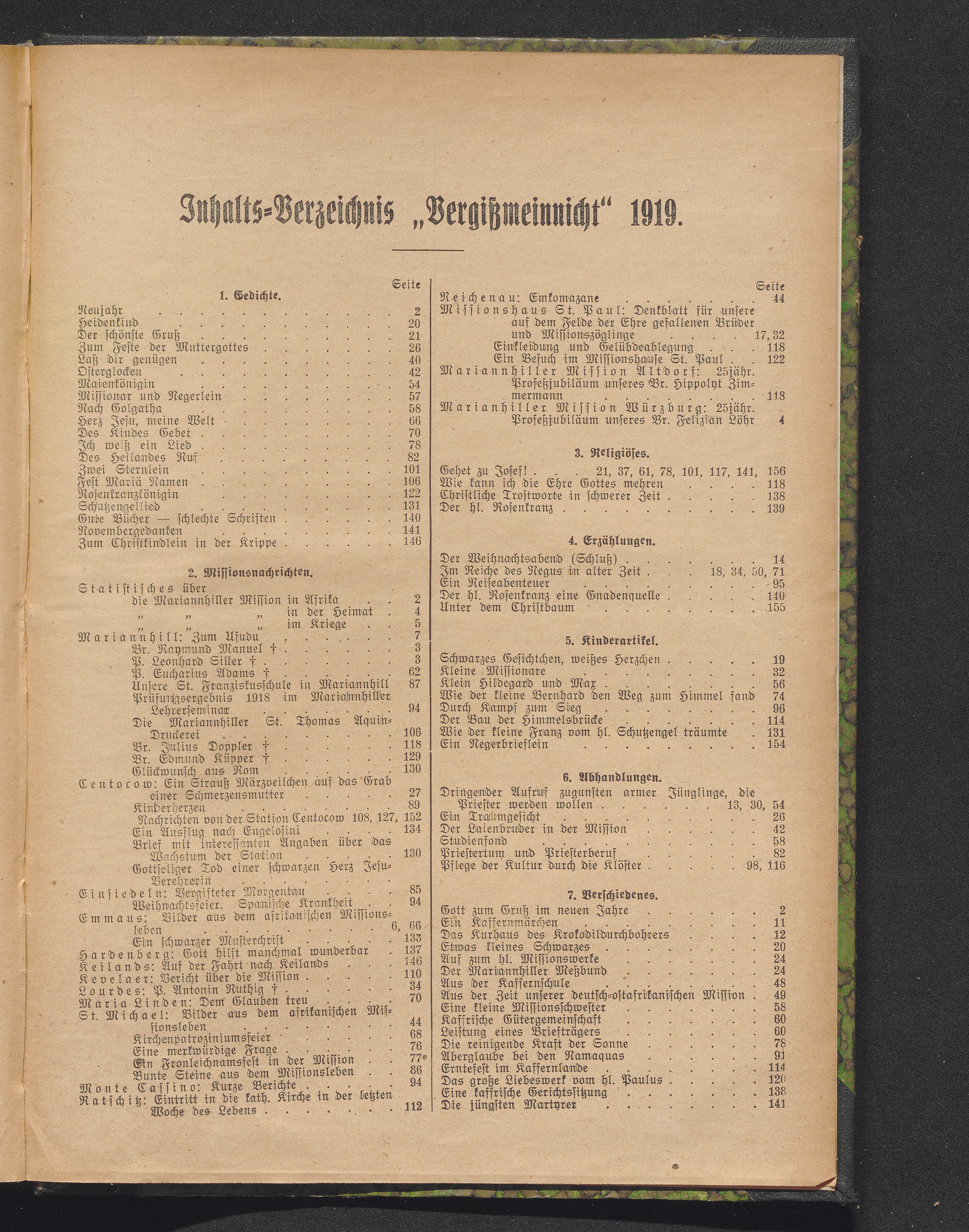 Inhalts-Verzeichnis "Vergißmeinnicht" 1919.
