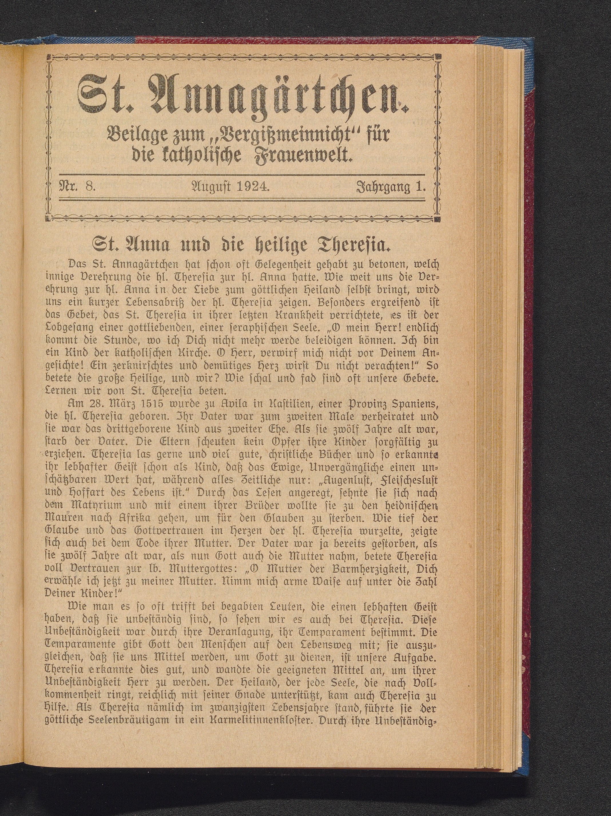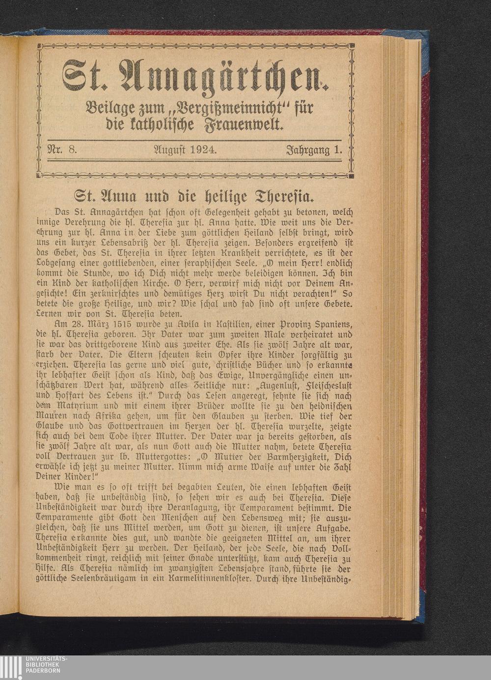 St. Annagärtchen. Beilage zum "Vergißmeinnicht" für die katholische Frauenwelt.