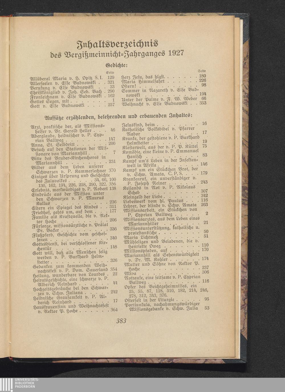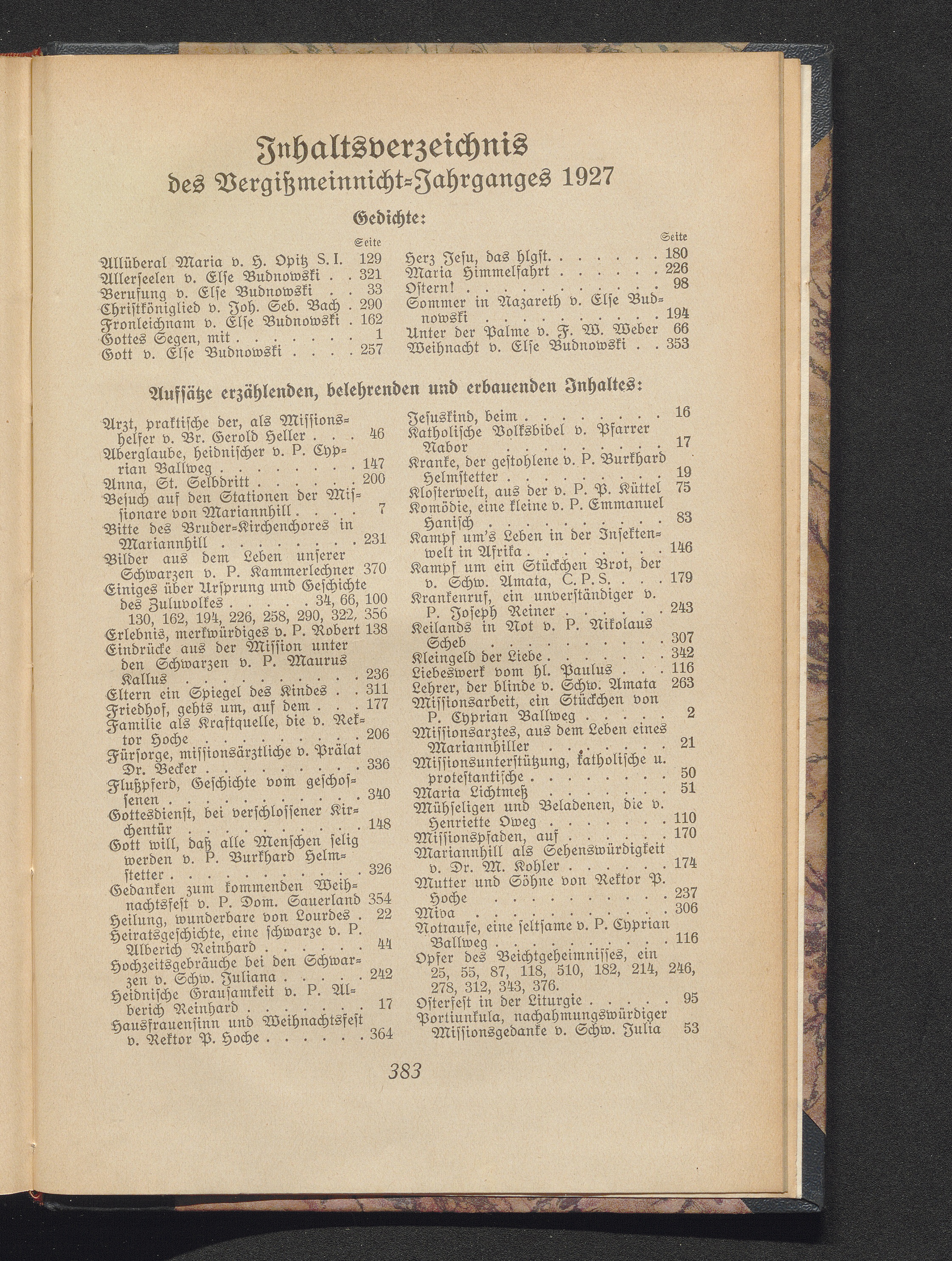 Inhaltsverzeichnis des Vergißmeinnicht-Jahrganges 1927