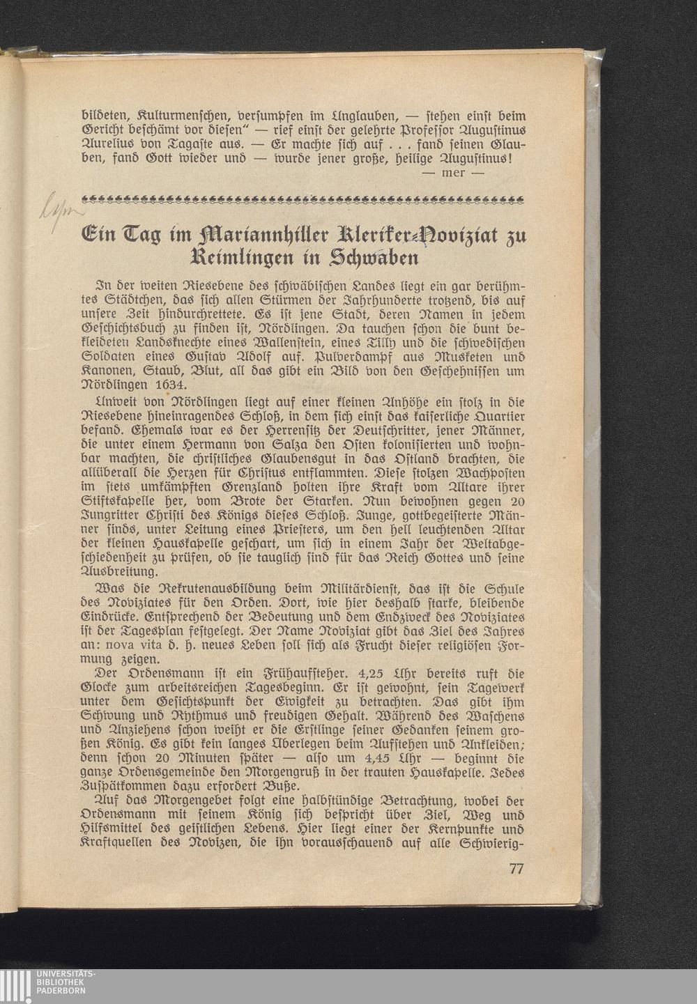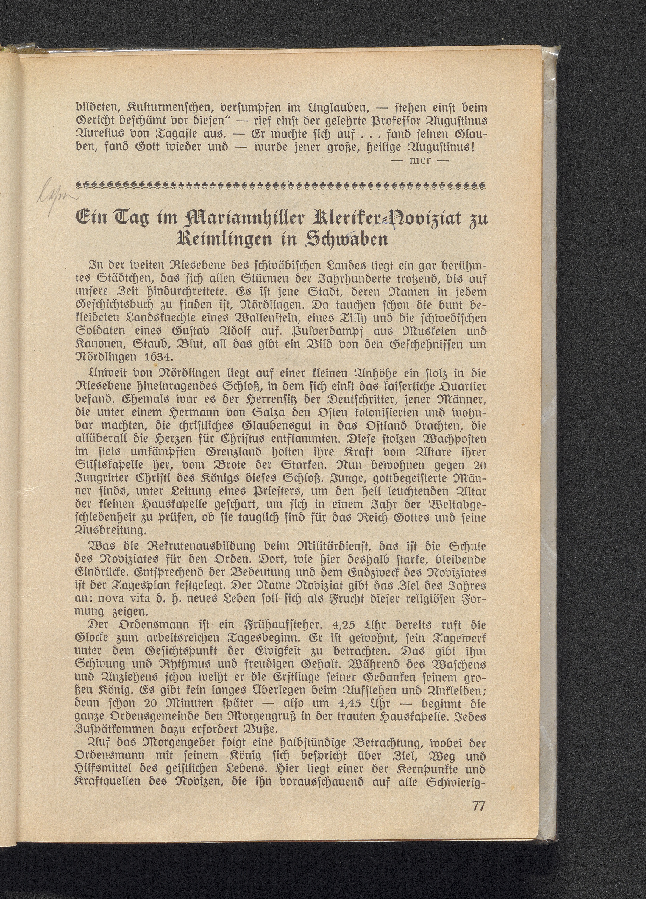 Ein Tag im Mariannhilller Kleriker-Proviziat zu Reimlingen in Schwaben.