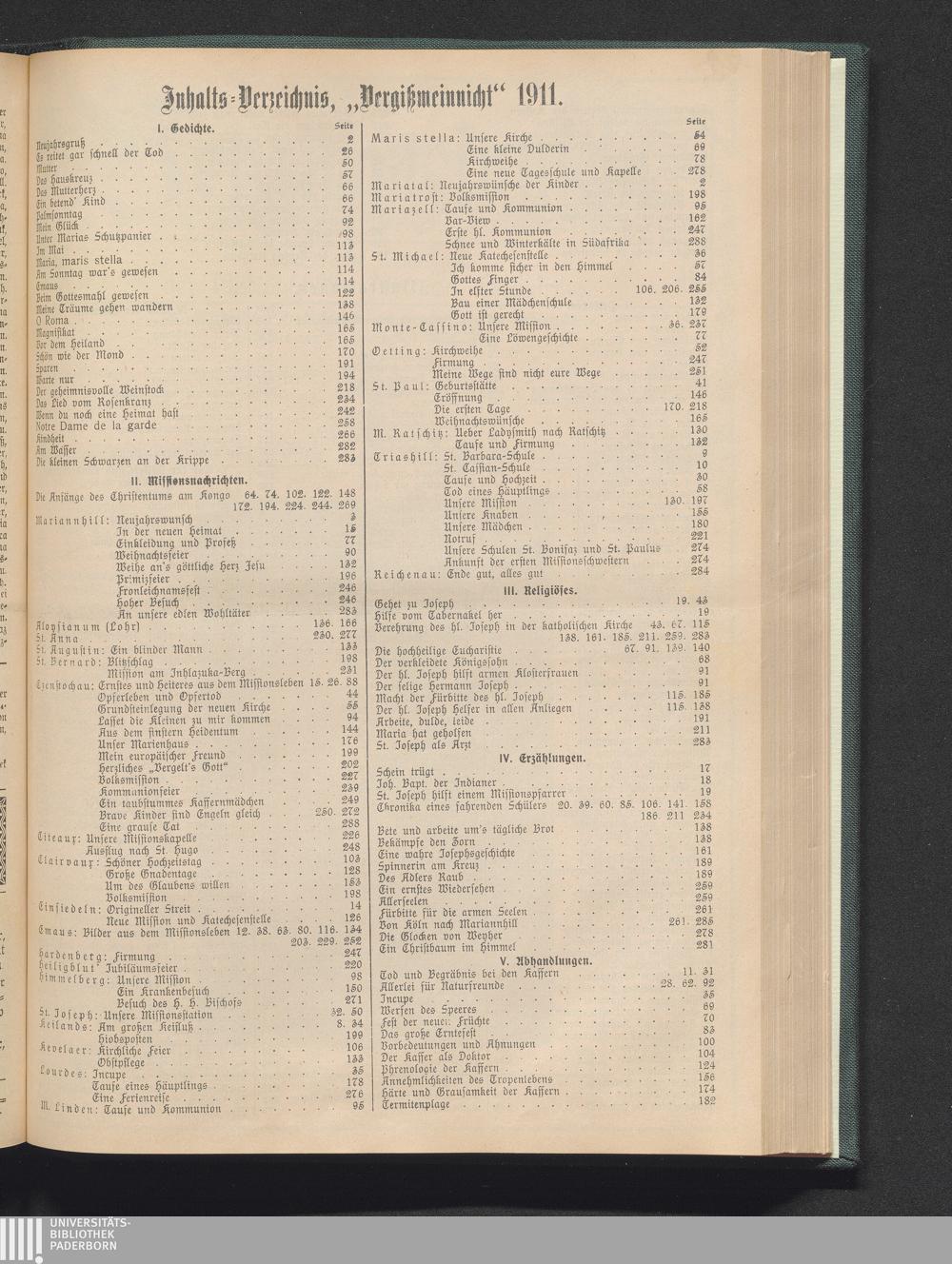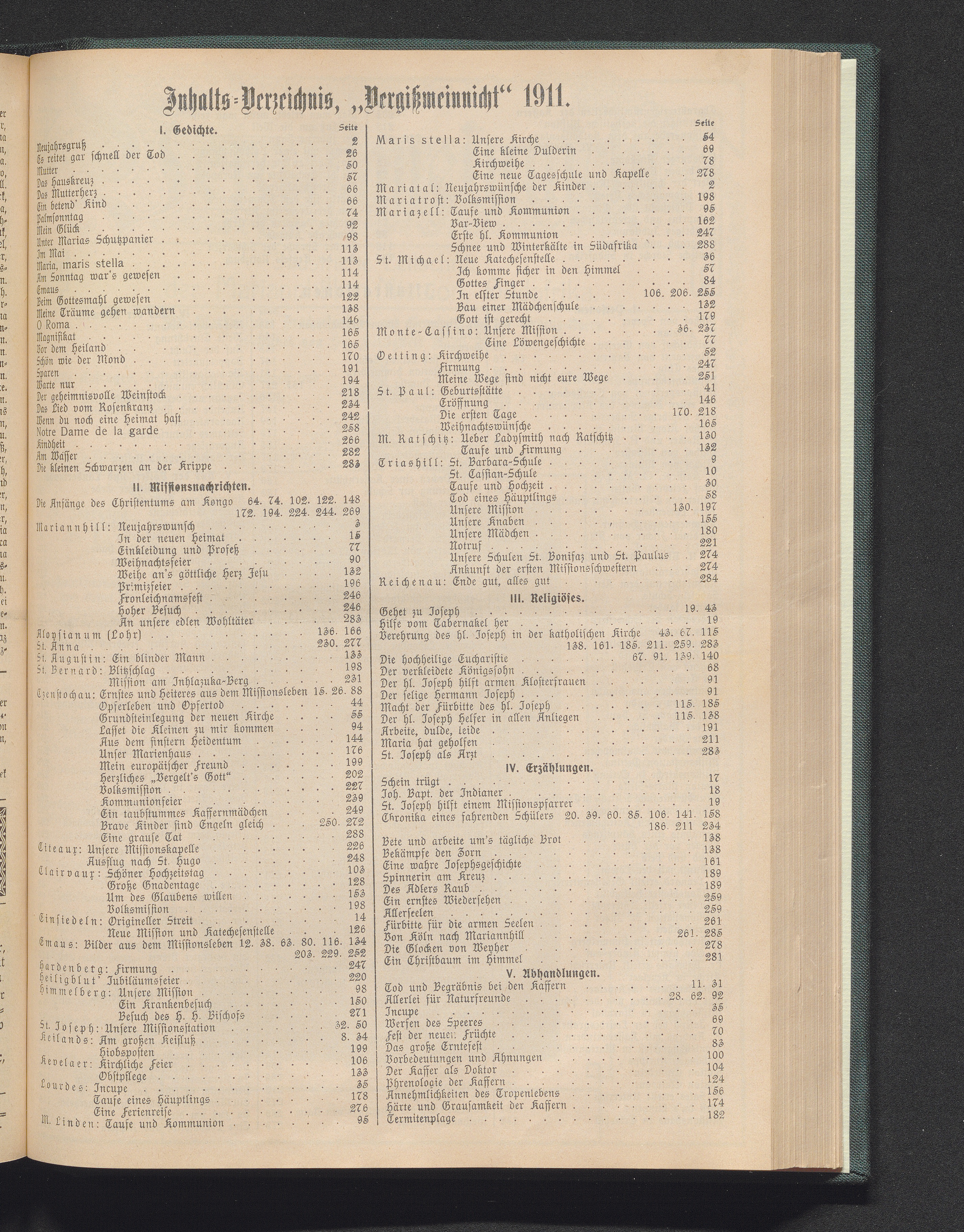 Jnhalts-Verzeichnis, „Vergißmeinnicht" 1911.