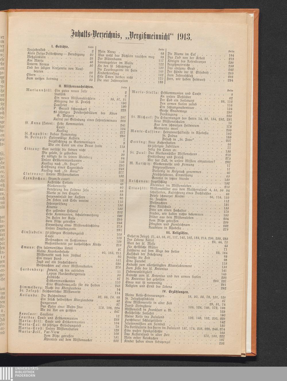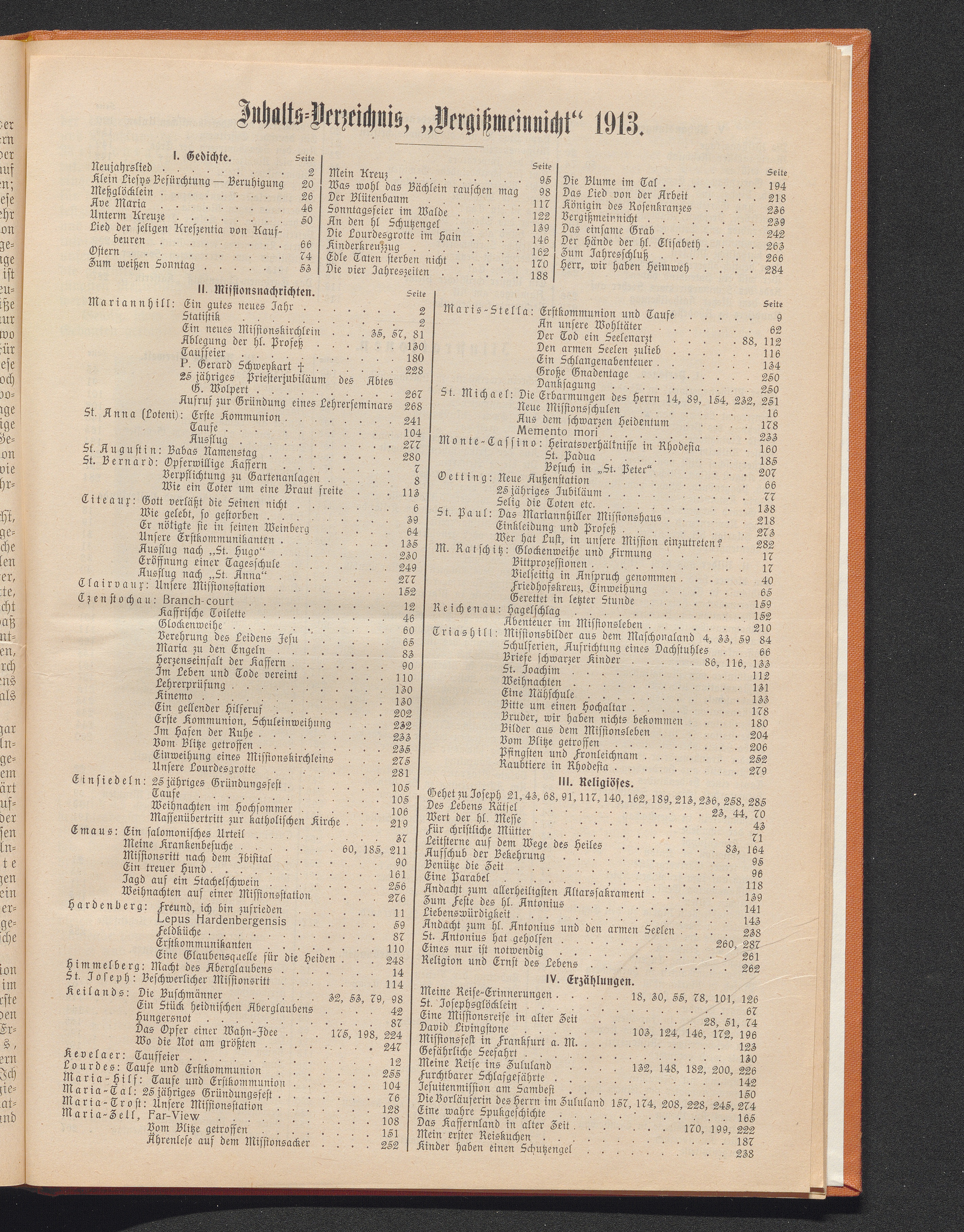 Inhalts-Verzeichnis, "Vergißmeinnicht" 1913.