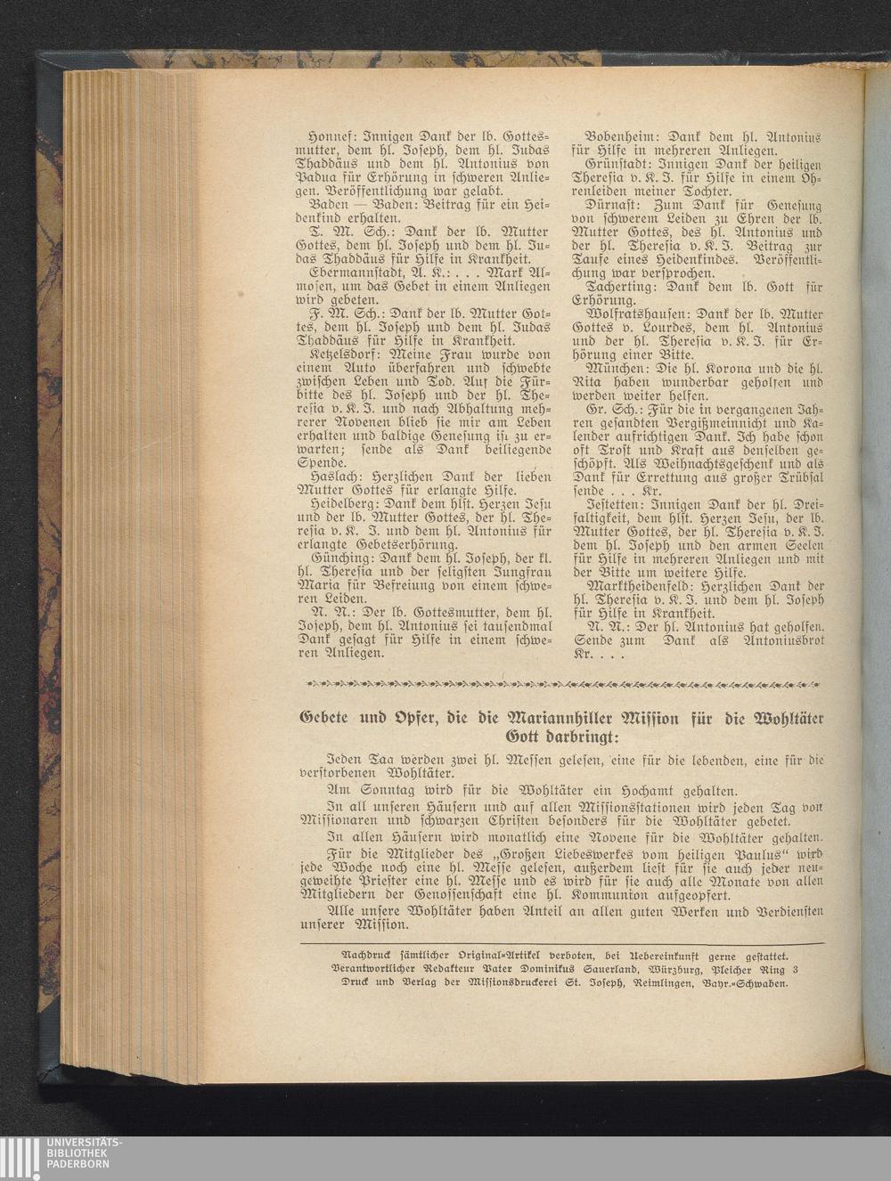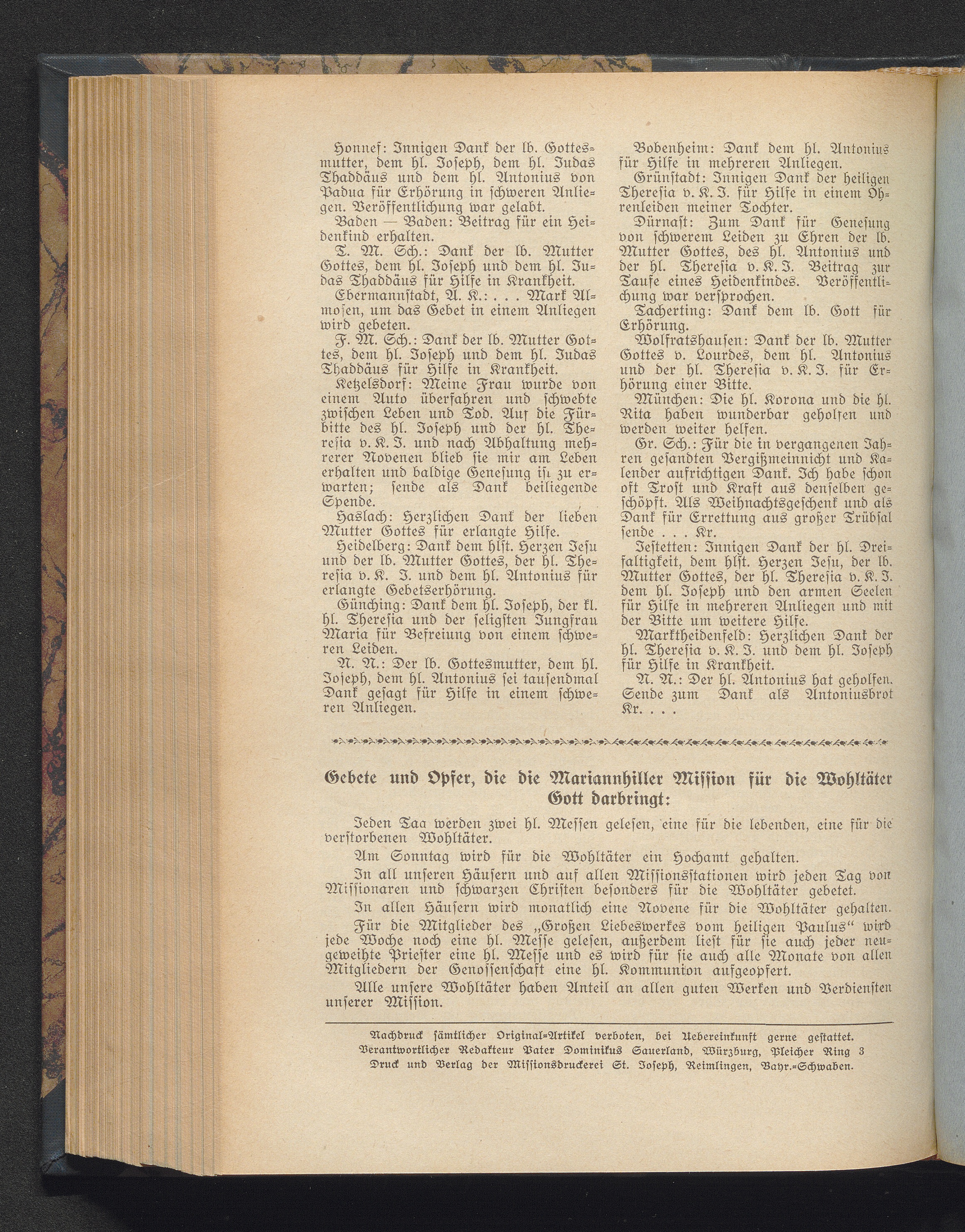 Gebete und Opfer, die die Mariannhiller Mission für die Wohltäter Gott darbringt[...]